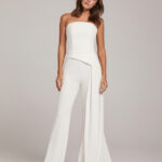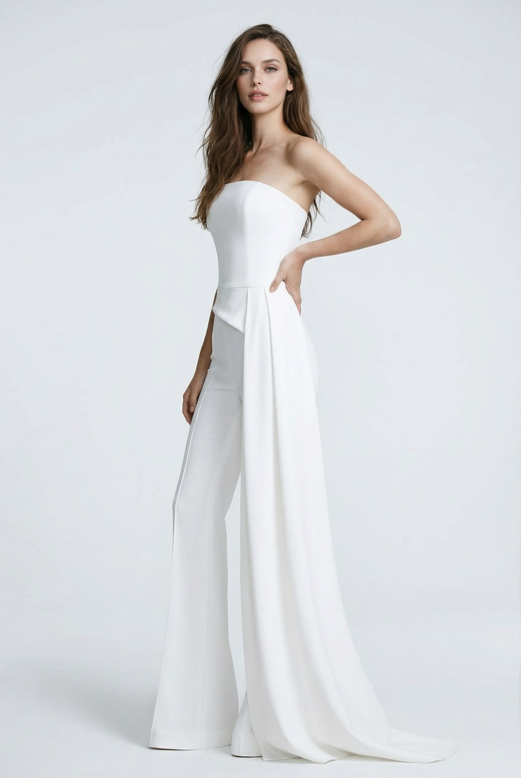 A refined and modern bridal jumpsuit designed with a clean strapless bodice and elegantly tailored wide-leg trousers. The asymmetric draped panel adds soft movement and couture character, creating a sophisticated statement for contemporary brides who prefer effortless elegance over tradition.