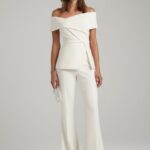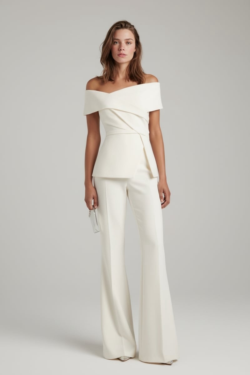 This off-shoulder bridal suit balances femininity and strength through clean tailoring and elegant proportion. Designed for brides who favor modern sophistication.