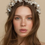 Işıltılı sedef yapraklar ve zarif metal detaylarla el işçiliği ile tasarlanmış, çiçek formunda modern bir taç. Yüzü doğal güzellik ve romantik bir zarafetle çerçeveleyen organik formlar, hafif bir ışıltı ve sofistike bir görünüm sunar. Hem hacimli hem sade saç modellerine kolayca uyum sağlayan bu zarif aksesuar, modern ama doğadan ilham alan bir stil arayan gelinler için mükemmel bir seçimdir.