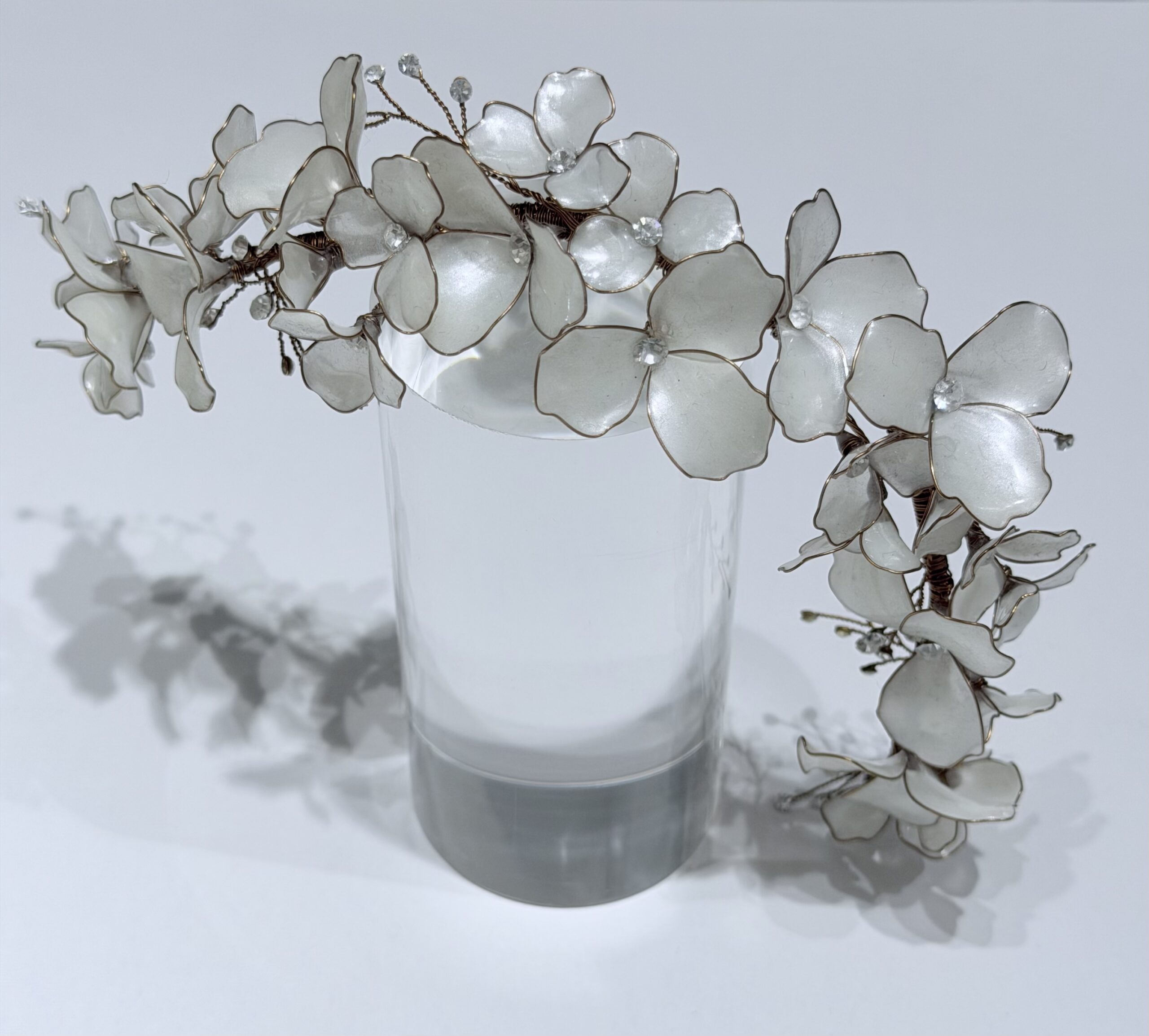 A delicate floral headpiece handcrafted with luminous mother-of-pearl petals and subtle metallic accents. Designed as a modern crown, it frames the face with soft, organic shapes that evoke natural beauty and effortless romance. Lightweight yet striking, it adds a refined touch of glow to bridal hairstyles, from loose waves to sleek updos. Perfect for brides seeking a contemporary accessory with an ethereal, botanical charm.