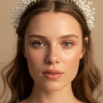 İnce yapı üzerinde zarif bir şekilde işlenmiş inci ağlarla tasarlanan, heykelsi ve modern bir saç aksesuarı. Baş etrafında zarif yukarı dogru oluşturan bu hafif tasarım, hareket ve ışıltı katarak çağdaş sanat ile zamansız gelinlik zarafetini birleştirir. Hem lüks hem de sade bir duruş isteyen gelinler için mükemmel bir statement parçadır.