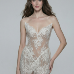 Modern gelinler için tasarlanan bu ivory mini elbise, cesur ve zarif bir duruşu couture işçilikle buluşturur. Transparan korse yapısı üzerine yerleştirilen dantel aplikeler, el işçiliği boncuk detaylarıyla ışığı zarif şekilde yansıtır.Bel hattını kusursuz biçimde vurgulayan korse formu, etek kısmındaki el işlemeli saçak detaylarıyla hareket kazanır. Derin sweetheart yaka, feminen bir siluet sunarken modern ve sofistike bir etki yaratır.