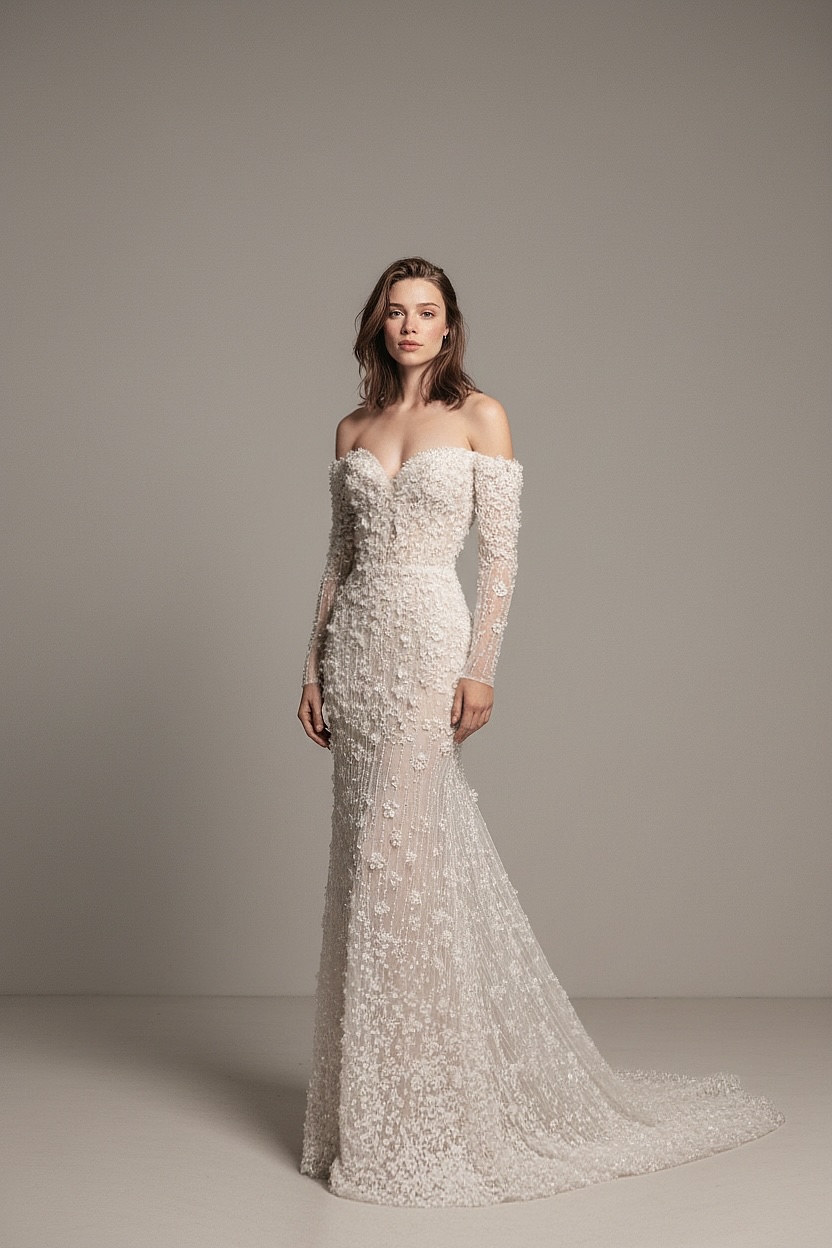 A romantic mermaid gown featuring a sculpted off-shoulder neckline and long fitted sleeves, enriched with intricate beadwork and 3D floral embellishments. The silhouette gently hugs the body before flowing into a graceful train, creating a refined yet sensual bridal statement.