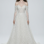 Vücuda oturan siluetiyle romantik bir görünüm sunan bu balık kesim gelinlik, off-shoulder yakası ve uzun dar kollarıyla zarif bir duruş sergiliyor. İnce işleme boncuklar ve üç boyutlu çiçek detaylarıyla zenginleştirilen elbise, vücudu zarifçe sararak şık ve iddialı bir duruş yaratıyor.