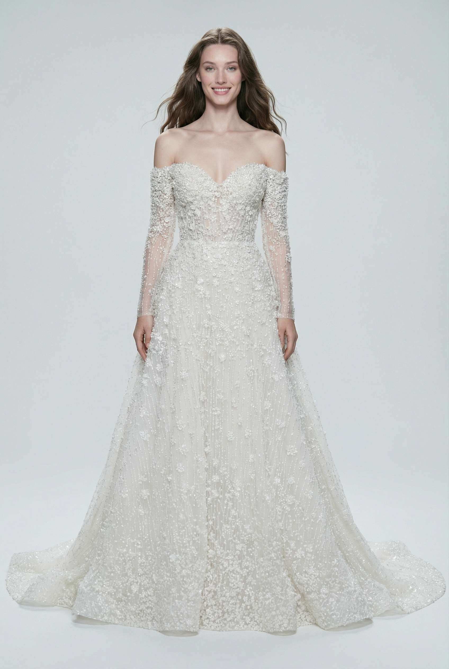 A romantic mermaid gown featuring a sculpted off shoulder neckline and long fitted sleeves, enriched with intricate beadwork and 3D floral embellishments. The silhouette gently falls the body before flowing into a graceful train, creating a refined yet sensual bridal statement.