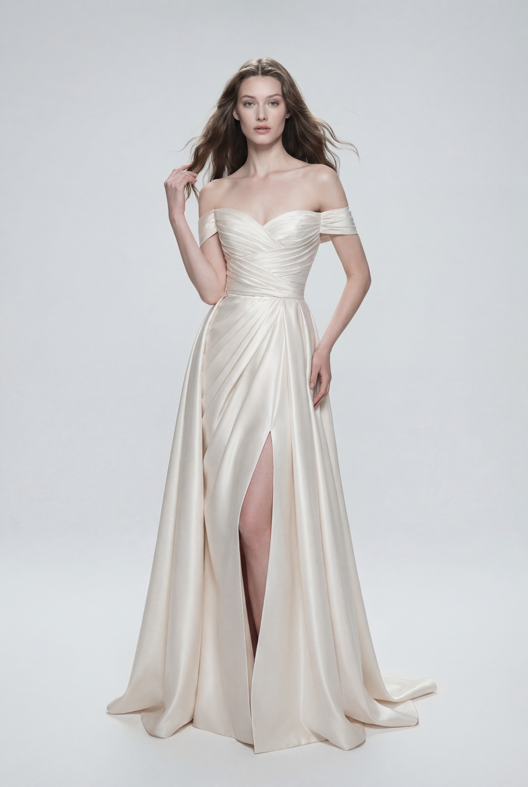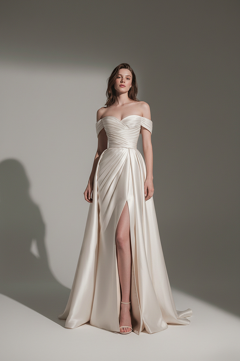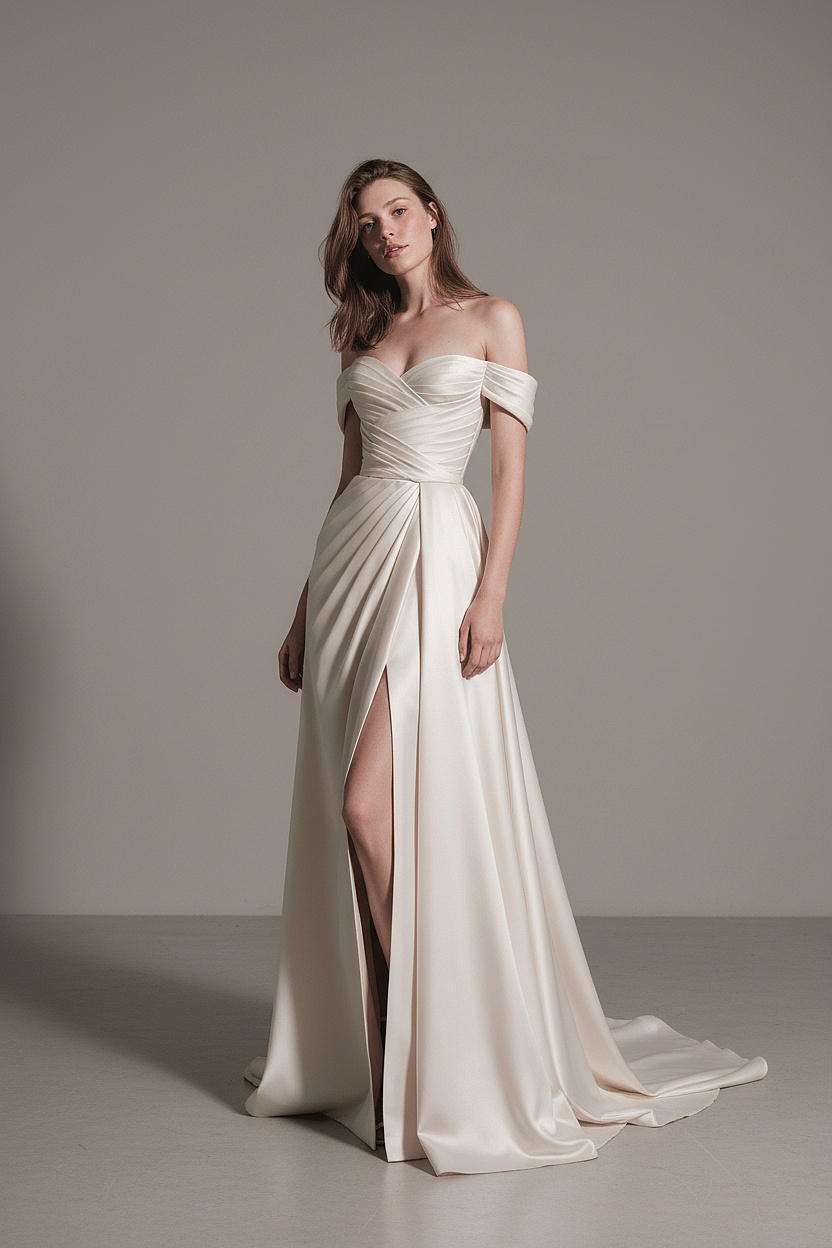 A breathtaking satin wedding gown featuring an elegant off-shoulder neckline and sculpted draped bodice that beautifully shapes the silhouette. The luxurious fabric flows into a softly pleated skirt with a refined front slit, offering effortless movement and modern allure while preserving timeless bridal elegance.