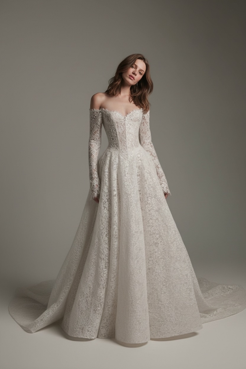 This romantic ball gown is defined by its off-shoulder neckline and sculpted lace corset bodice, designed to frame the décolletage with soft elegance. Long lace sleeves extend the silhouette with graceful continuity, while the full skirt flows effortlessly from the waist, creating a timeless and regal presence. Crafted entirely in delicate lace, this gown balances classic bridal romance with modern couture precision.