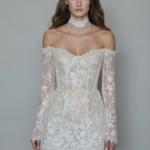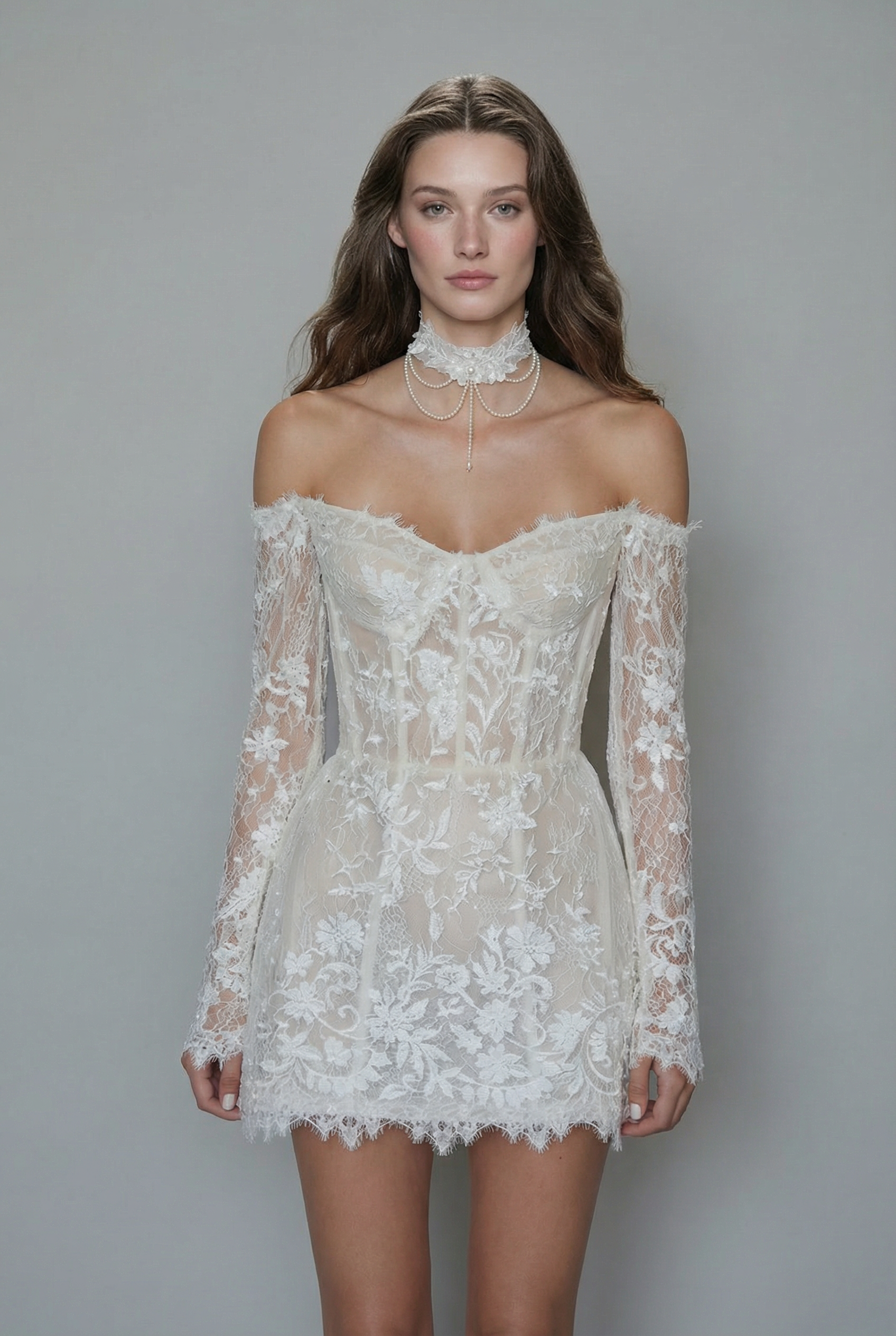 An illusion lace corset with a romantic off-shoulder neckline shapes the silhouette with refined precision. Long lace sleeves add delicate elegance, while the mini length offers a modern, confident edge. A couture-inspired bridal mini designed for civil ceremonies, receptions, or after-party moments.