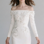 Bu zarif mini gelinlik, omuzları nazikçe saran omuz dekolteli yaka ve uzun dar kollarıyla modern bir şıklık sunar. Üç boyutlu çiçek aplikeleri ve ince boncuk detayları korse bölümüne romantik bir dokunuş kazandırır. Temiz ve yapılandırılmış siluetiyle dikkat çeken bu tasarım, şeffaf duvakla tamamlanarak nikâh törenleri, modern davetler ve couture gelin anları için ideal bir seçenek oluşturur.