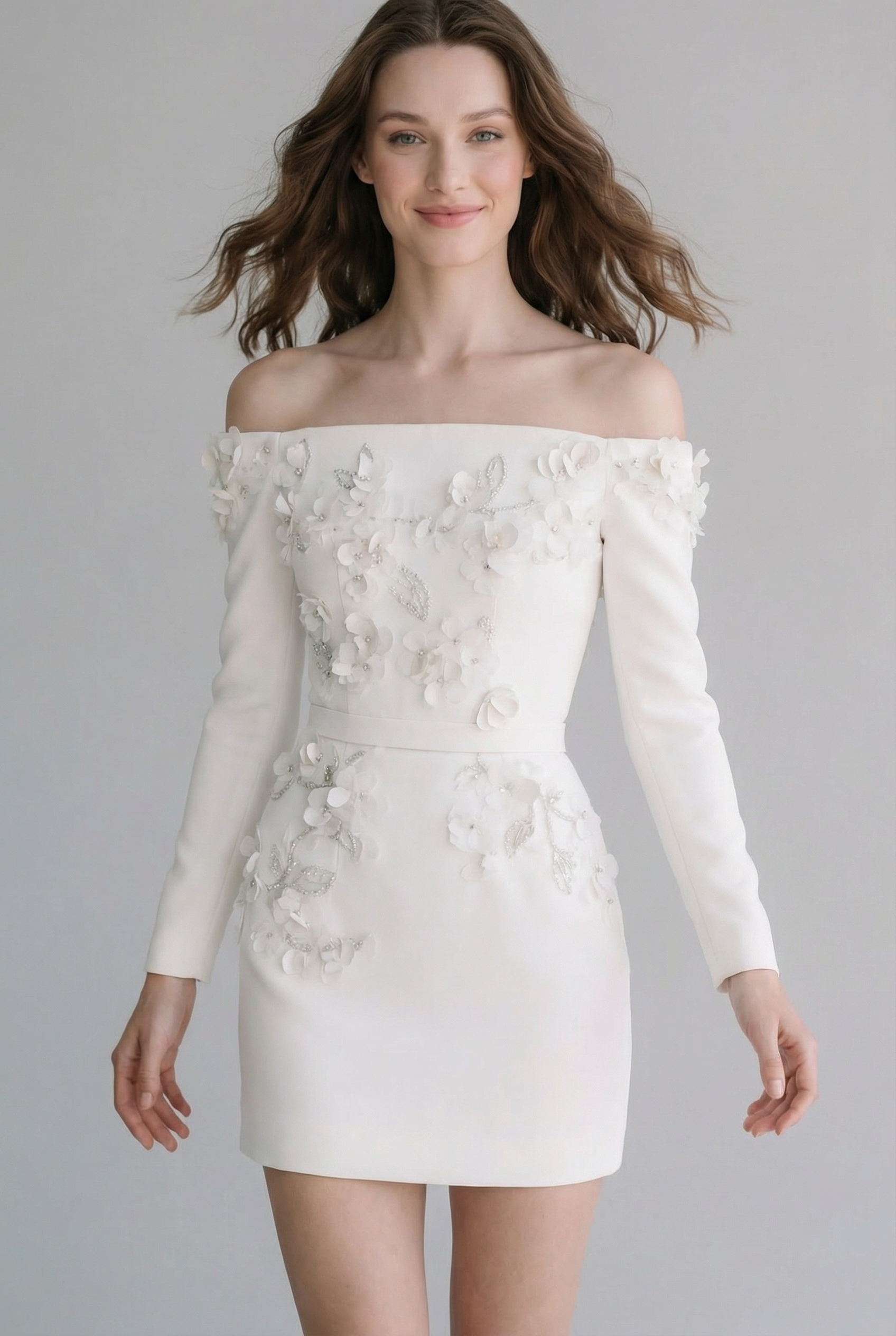 This elegant mini bridal dress features an off-shoulder neckline that softly frames the décolletage, paired with long fitted sleeves for a refined balance. Three-dimensional floral appliqués and delicate bead accents embellish the bodice, adding texture and romantic detail. Crafted in a clean, sculpted silhouette and completed with a sheer veil, this design is ideal for civil ceremonies, modern receptions, or couture bridal moments.