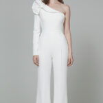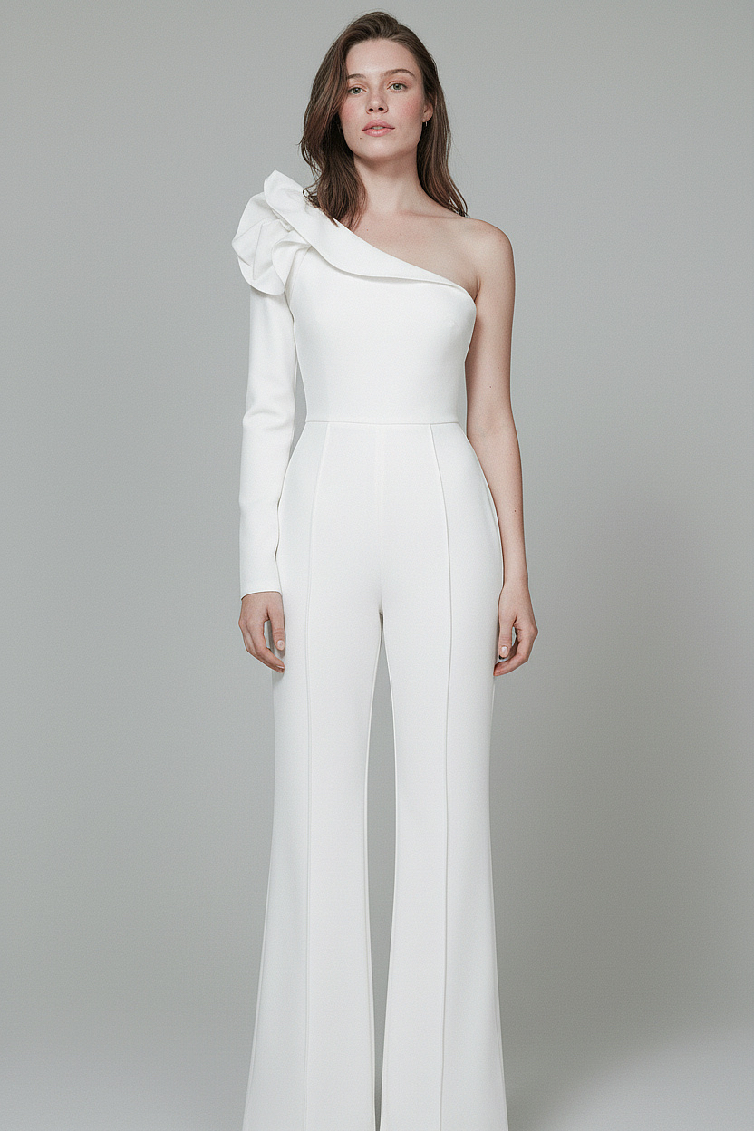 A striking one-shoulder bridal jumpsuit designed for the modern bride. Featuring a sculpted bodice with an elegant ruffle detail and perfectly tailored wide-leg trousers, it blends strong structure with feminine softness. Effortlessly chic, confident, and fashion-forward.