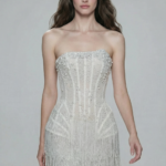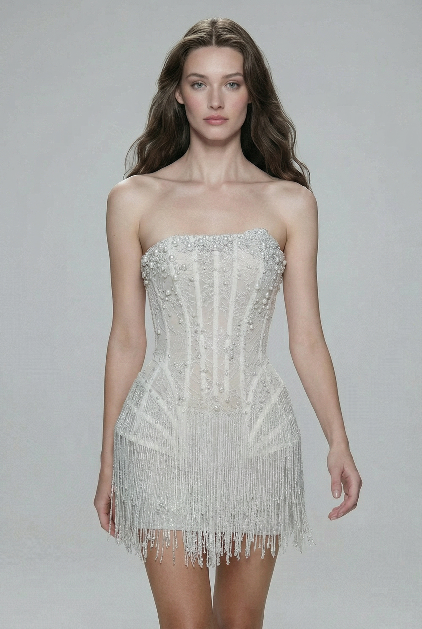 A sculpted strapless corset adorned with intricate bead embroidery defines the silhouette with refined glamour. Vertical boning enhances structure, while shimmering fringe detailing along the mini skirt adds movement and a playful couture finish. Designed for modern brides seeking a bold, celebratory look for receptions, parties, or after-wedding moments.