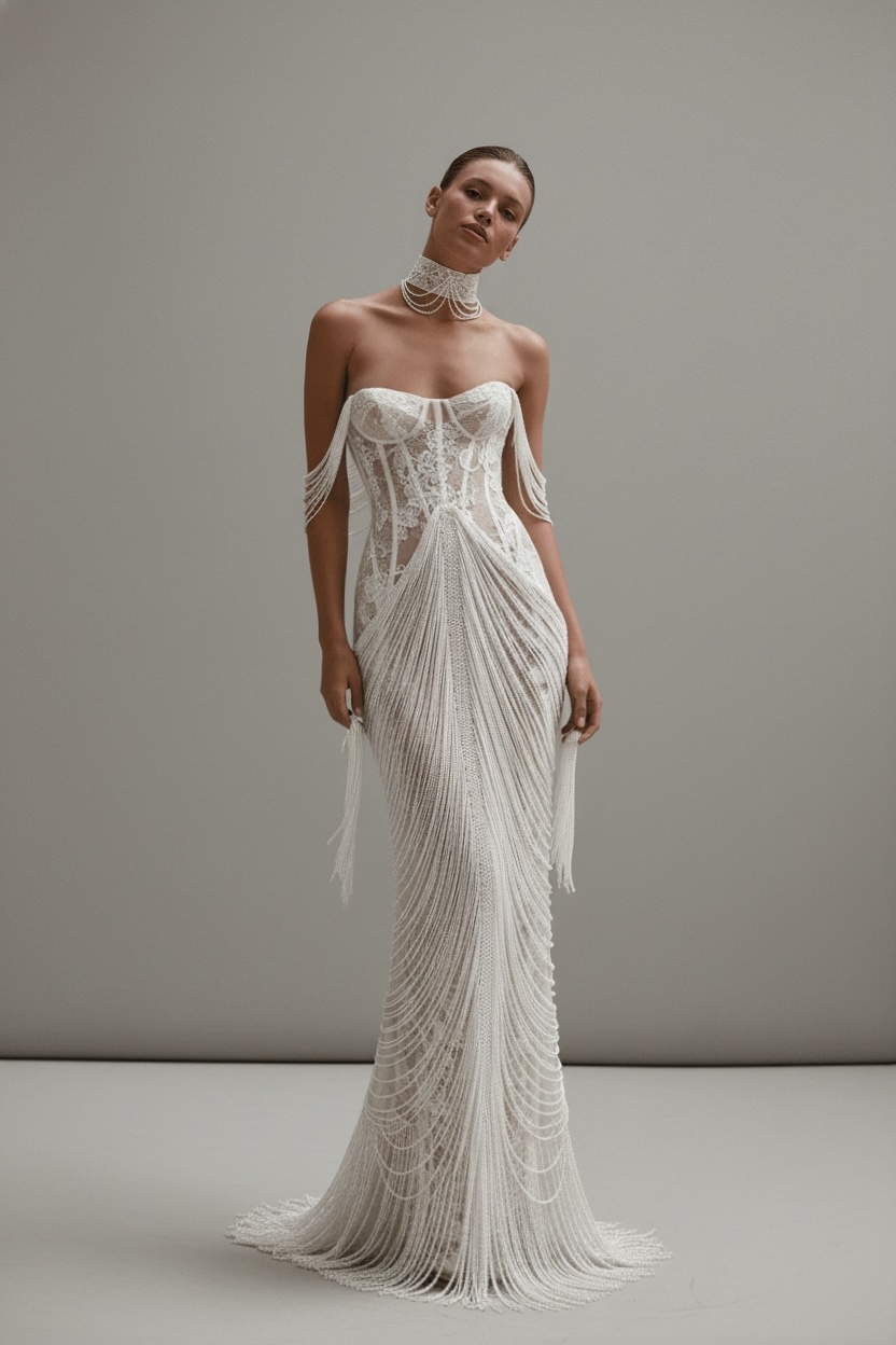 A striking strapless couture gown defined by a sculpted lace corset and cascading pearl drapery that flows fluidly along the silhouette. Finished with delicate pearl shoulder chains and a matching choker detail, this design delivers a bold yet refined statement, blending sensual structure with modern bridal artistry.