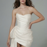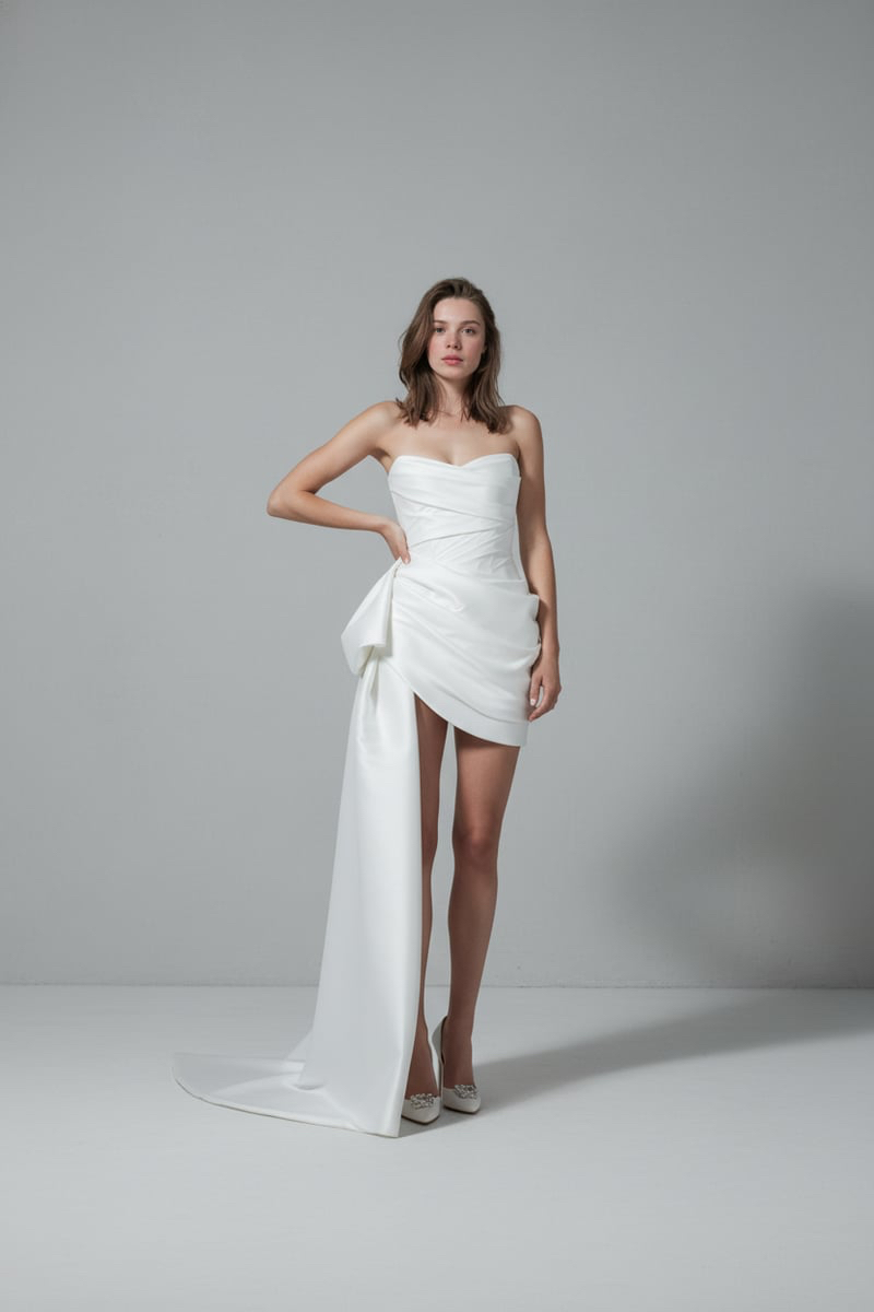 Bu modern mini gelinlik, straplez yaka formu ve vücudu zarifçe saran çapraz drapeleriyle güçlü ve feminen bir siluet sunar. Yan kısımdaki iddialı fiyonk detayı tasarıma couture bir dokunuş katarken, asimetrik etek boyu modern ve cesur bir duruş yaratır. Nikâh, after party ve şehir düğünleri için şık ve çağdaş bir tercihtir.
