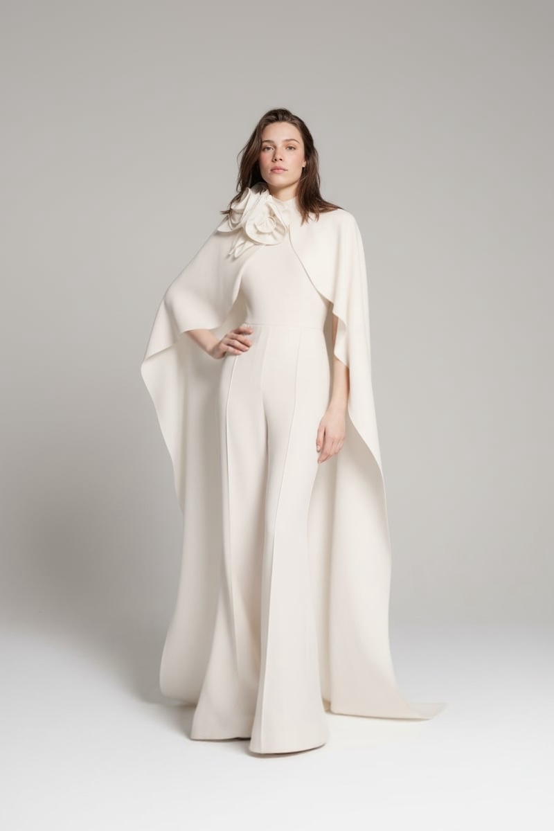 A sleek bridal jumpsuit defined by clean lines and fluid movement. The softly draped cape and floral accent create an elegant balance of strength and femininity.