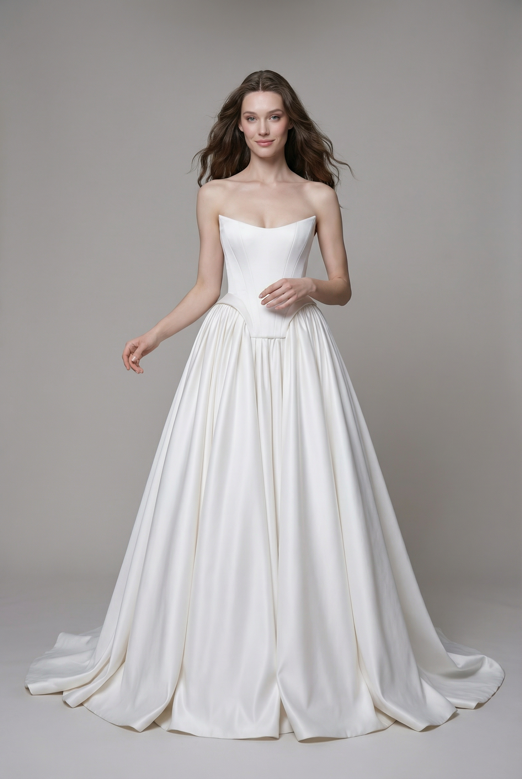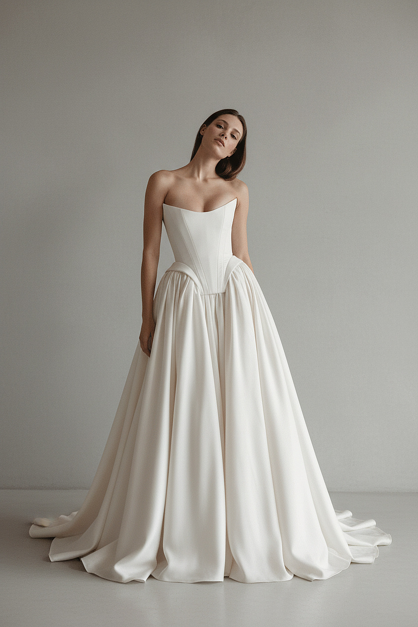 A striking strapless bridal dress featuring a beautifully defined corset bodice that shapes the waist with precision. The voluminous flowing skirt adds movement and grandeur, creating a refined balance of modern strength and timeless elegance.