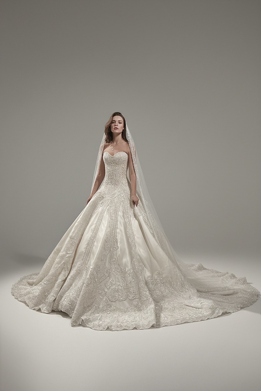A breathtaking couture ball gown, richly adorned with luxurious lace appliqués and intricate beadwork. The structured bodice flows into a voluminous grand skirt, creating an unforgettable royal bridal presence.