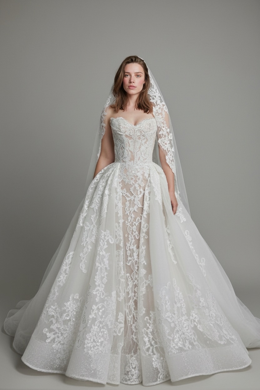 A breathtaking couture wedding gown featuring a sculpted corset bodice and a voluminous ballgown skirt, richly detailed with intricate floral lace. The sheer illusion base adds modern allure, while layered tulle creates dramatic movement and depth. Finished with a matching lace-trimmed veil, this gown blends romance, elegance, and bold sophistication for a bride who wants to make a striking entrance.