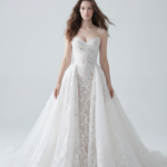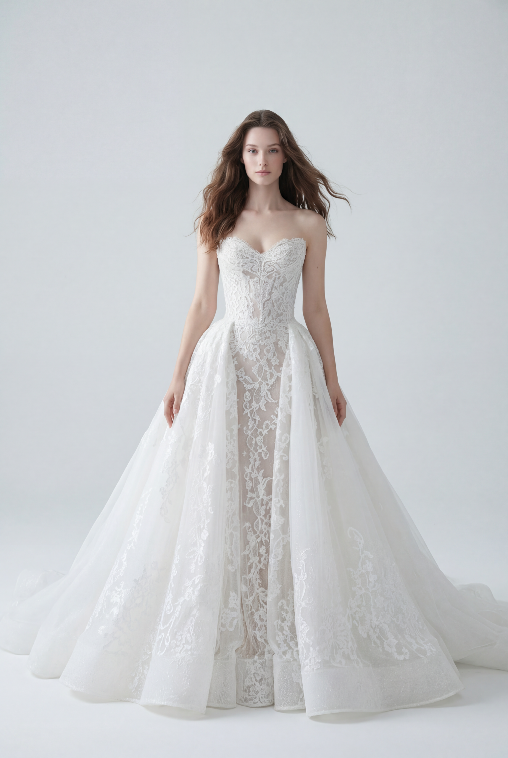 Korsaj gövdesi ve hacimli prenses etek formu ile tasarlanan bu couture gelinlik, zengin çiçek dantel işlemeleriyle dikkat çeker. Şeffaf illüzyon detaylar modern bir çekicilik katarken, katmanlı tül yapısı elbiseye hareket ve ihtişam kazandırır. Dantel bordürlü uyumlu duvakla tamamlanan bu tasarım; zarafet, romantizm ve güçlü bir duruşu bir araya getirerek unutulmaz bir giriş yapmak isteyen gelinler için ideal.