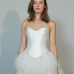 Straplez korsajı ile öne çıkan bu mini elbise, pürüzsüz üst formu ile hacimli tüy eteği kusursuz bir dengede buluşturur. Yapı ve hareket arasındaki kontrast, tasarıma güçlü ve modern bir karakter kazandırır. Couture işçiliğiyle hazırlanan bu parça, çağdaş gelinler ve özel davetler için iddialı bir siluet sunar.