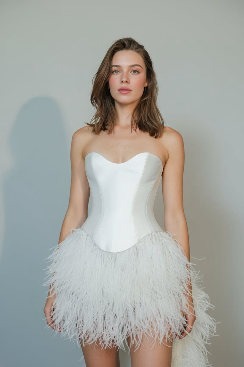 This statement mini dress features a sharply contoured strapless corset that defines the waist with architectural precision. The clean, smooth bodice contrasts beautifully with a voluminous feather skirt, creating a bold interplay of structure and movement. Designed for modern brides and elevated celebrations, this piece delivers confident glamour with couture-level craftsmanship.