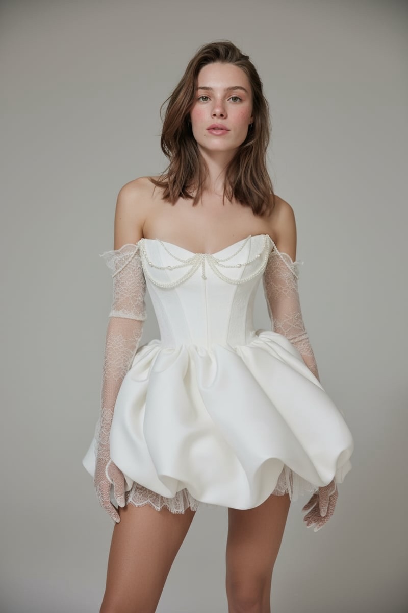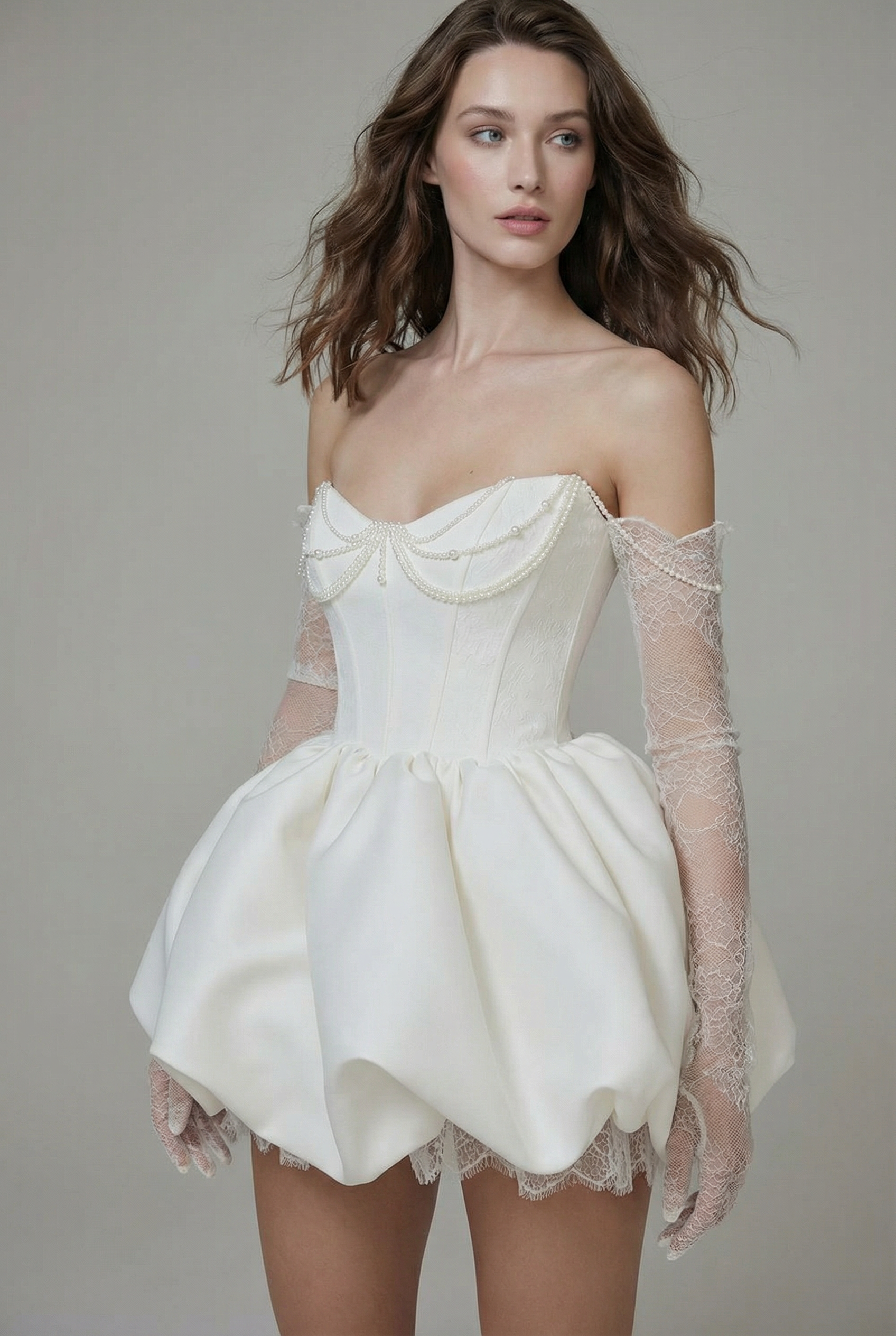 Expert corsetry shapes the torso with precision, finished with a structured yet playful skirt. Illusion lace sleeves frame the arms delicately, balancing strength with romantic lightness.