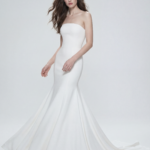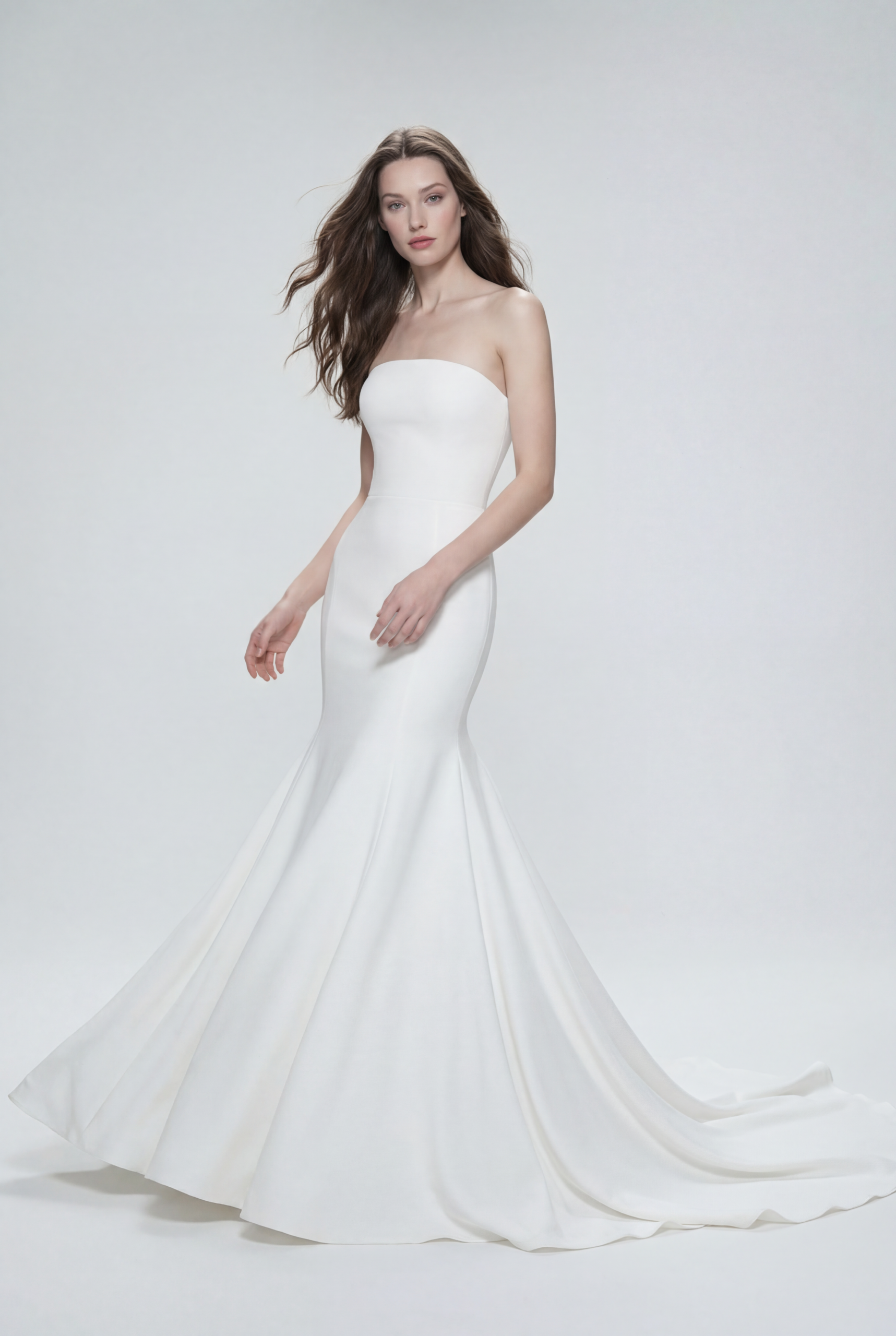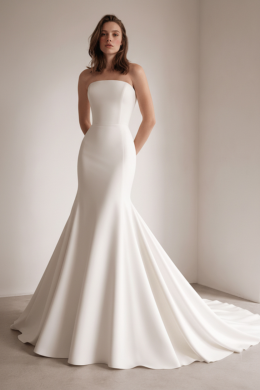 A refined strapless bridal dress designed with a sleek, body-skimming silhouette that gently flares into a graceful train. Crafted from smooth satin, it enhances the figure with clean lines, modern structure, and timeless elegance.