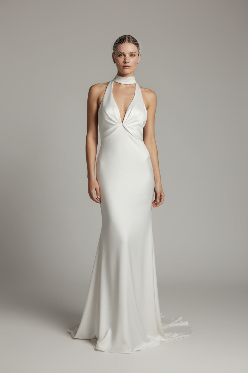 A sleek and modern silhouette crafted in lustrous satin, this halter-neck gown features a deep, sculpted neckline that frames the décolletage with effortless elegance. The fluid, body-skimming cut gently flares into a soft train, creating a refined and sensual bridal presence. Perfect for brides who appreciate minimalism with powerful impact.