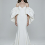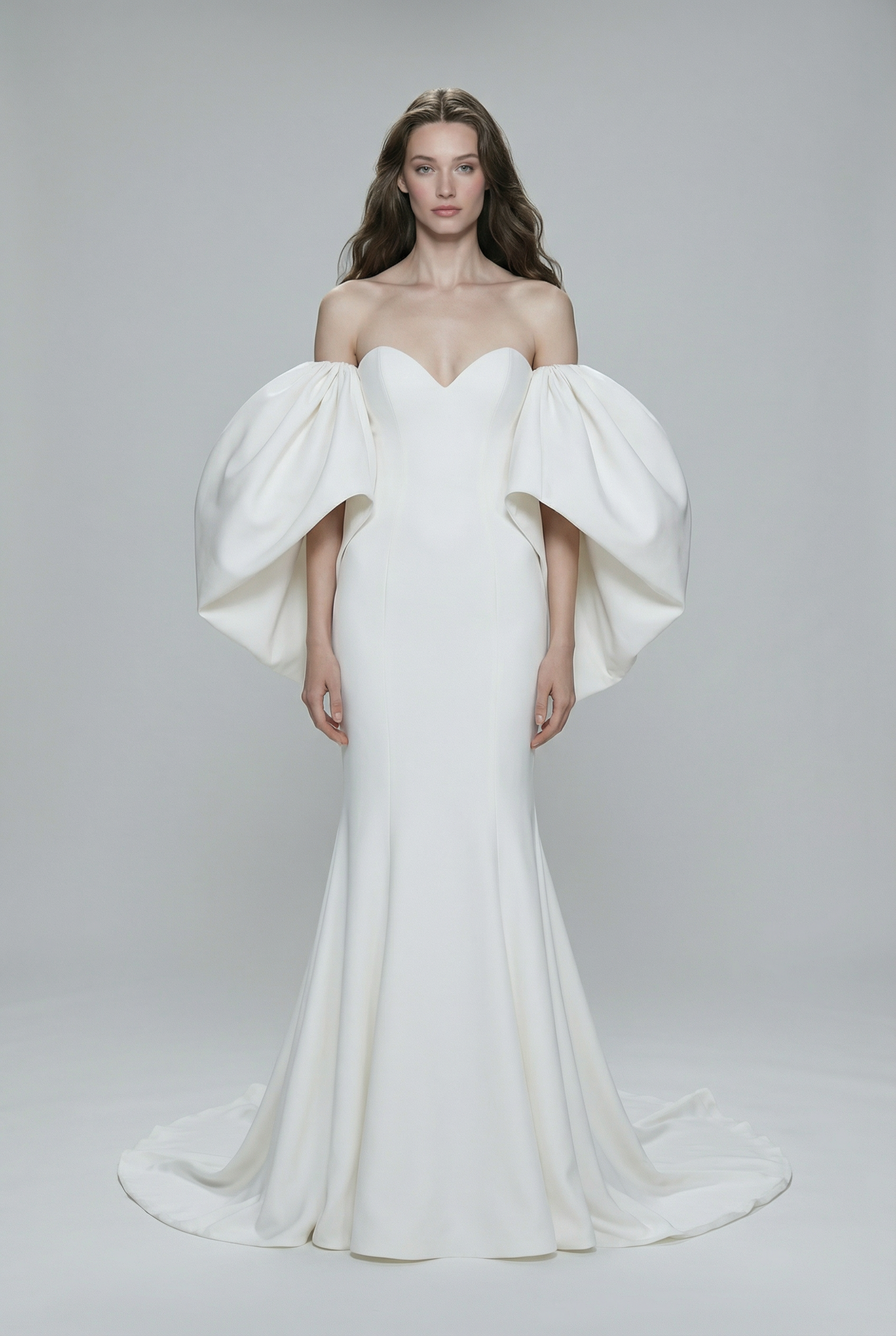 A striking couture gown defined by its sculpted off-shoulder neckline and breathtaking voluminous sleeves. The sleek, fitted silhouette gracefully flares into a soft train, balancing modern minimalism with powerful high-fashion drama. Perfect for brides seeking elegance with an unforgettable couture edge.