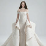 Mimari incelikle tasarlanmış nefes kesici bir couture parçası. Straplez üst kısmı ile başlayan bu prenses gelinlik, kalçadan aşağıya doğru inen heykelsi drapelerle dramatik bir hacim ve güçlü bir silüet yaratır. İnce işçilikle işlenen nakışlar ve zarif boncuk detayları, elbisenin üzerinde organik dal desenleri oluşturarak romantik dokunuşu modern bir güçle buluşturur. Sanatsal, zarif ve unutulmaz bir duruş arayan gelinler için tasarlandı.
