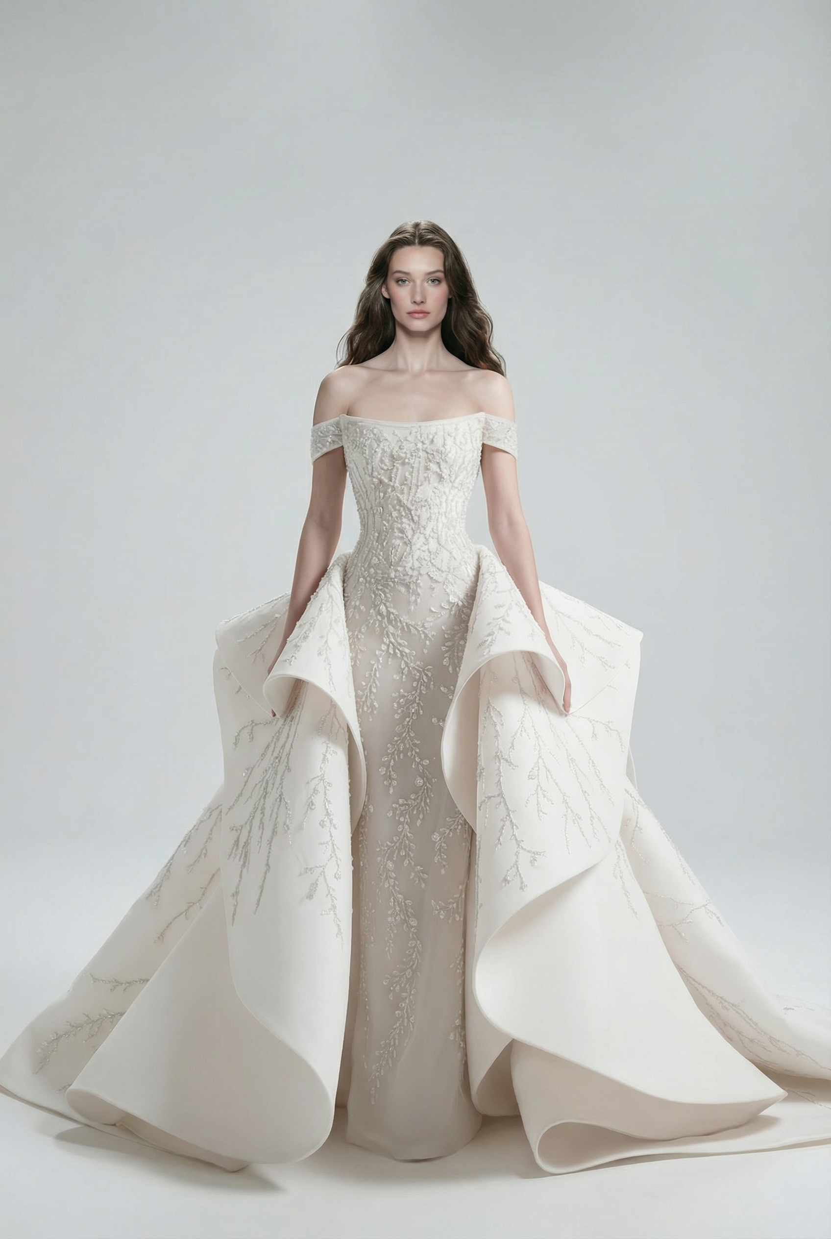 A breathtaking couture masterpiece crafted with architectural precision. This strapless ball gown features a structured silhouette with dramatic sculptural folds cascading from the hips, creating powerful volume and movement. Intricate embroidery and delicate beadwork trace organic, branch-like patterns across the gown, blending softness with bold modern drama. Designed for the bride who desires artistry, elegance, and an unforgettable presence.