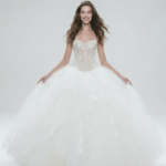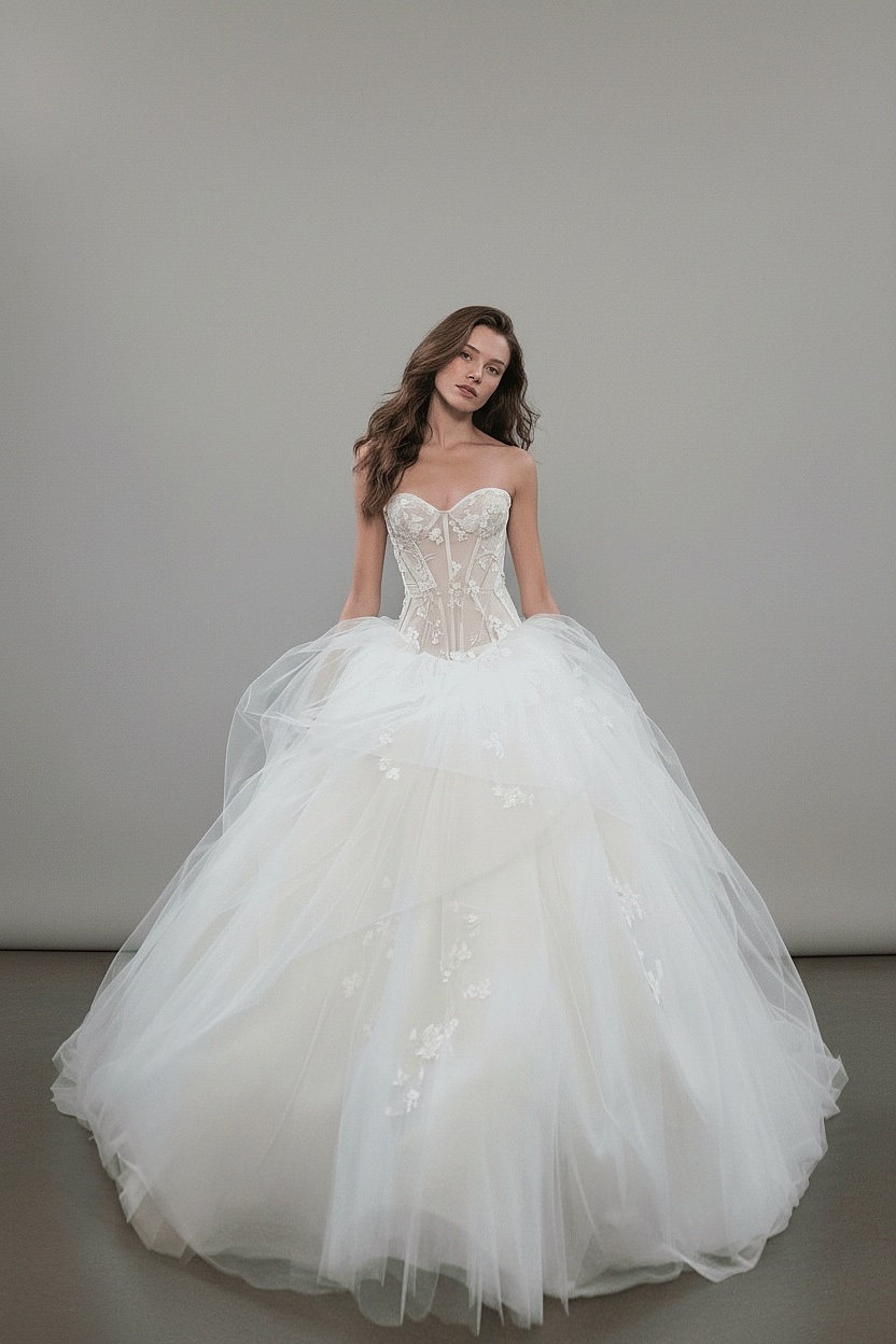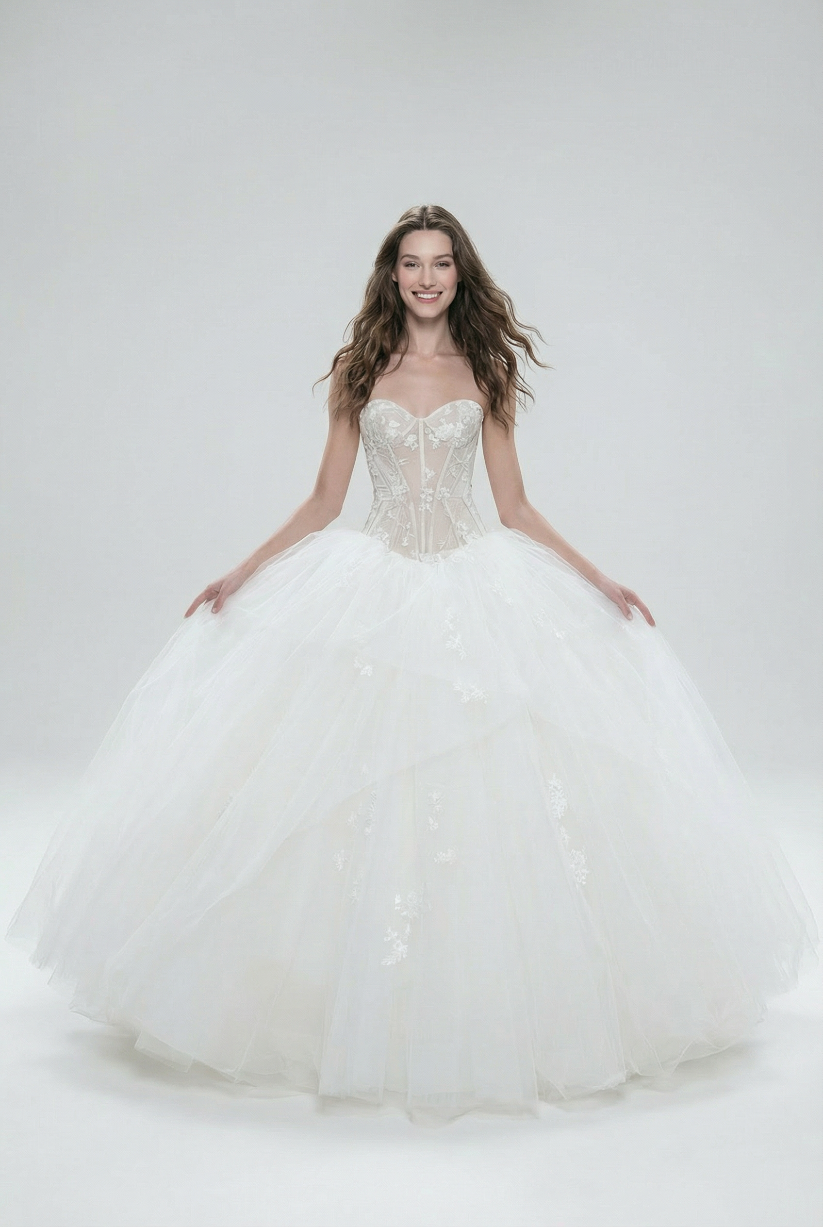 A breathtaking couture ballgown featuring a sheer structured corset that beautifully sculpts the bodice, adorned with delicate floral appliqués. Layers of soft, cloud-like tulle create a dreamy, voluminous skirt, giving the gown movement, romance, and modern fairytale elegance. A perfect statement for brides seeking both allure and softness.