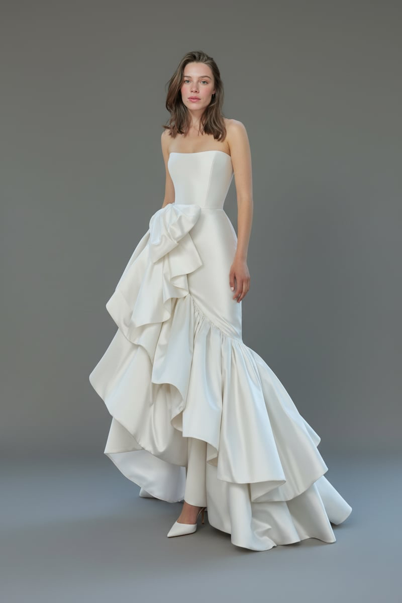 A sleek strapless corset bodice creates a clean, elongated silhouette before flowing into a dramatic cascade of sculptural ruffles. Crafted in structured satin, the asymmetrical skirt introduces architectural volume and couture movement. A bold yet refined bridal statement designed for modern ceremonies and unforgettable entrances.