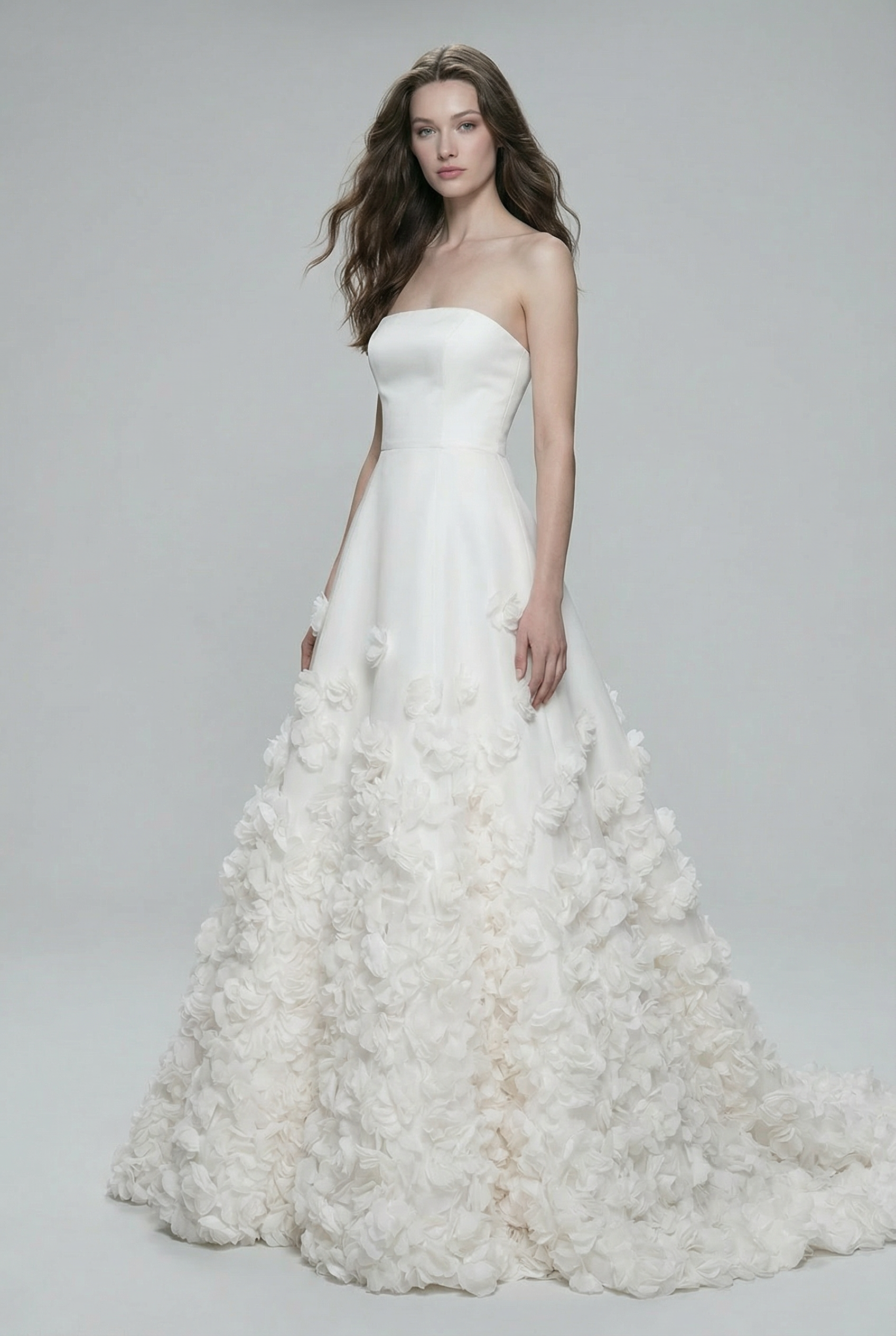 A clean, structured strapless bodice shapes the silhouette with refined simplicity, allowing the dramatic skirt to take center stage. The voluminous ball gown skirt is richly adorned with three-dimensional floral appliqués, creating couture texture and romantic depth. A striking bridal design for brides seeking timeless elegance elevated by bold, sculptural detail.