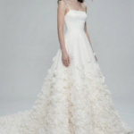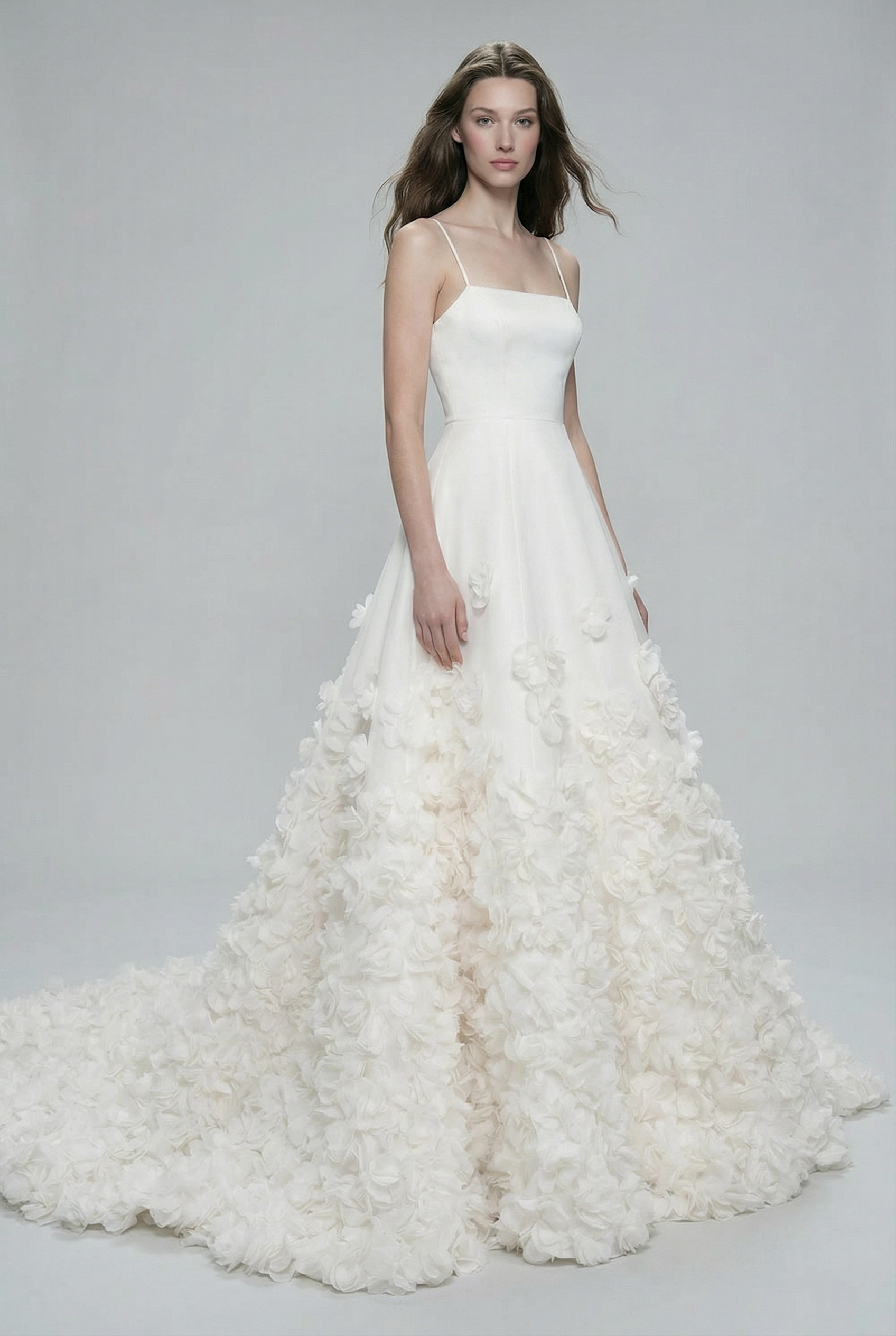 Sade ve yapılandırılmış straplez korse, silueti zarif bir netlikle şekillendirirken dikkatleri tamamen eteğe taşır. Üç boyutlu çiçek aplikeleriyle zenginleştirilmiş hacimli prenses etek, tasarıma couture dokusu ve romantik bir derinlik kazandırır. Zamansız zarafeti iddialı ve heykelsi detaylarla buluşturan etkileyici bir gelinlik tasarımıdır.