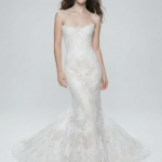 Bu zarif balık form gelinlik, baştan sona ince dantel işçiliğiyle tasarlanmıştır. Straplez yaka, üst bedeni sade bir şıklıkla vurgularken, vücudu saran siluet dizden itibaren yumuşak bir açılımla devam eder. Minimal ama etkileyici bir duruş arayan modern gelinler için zamansız bir seçenektir.