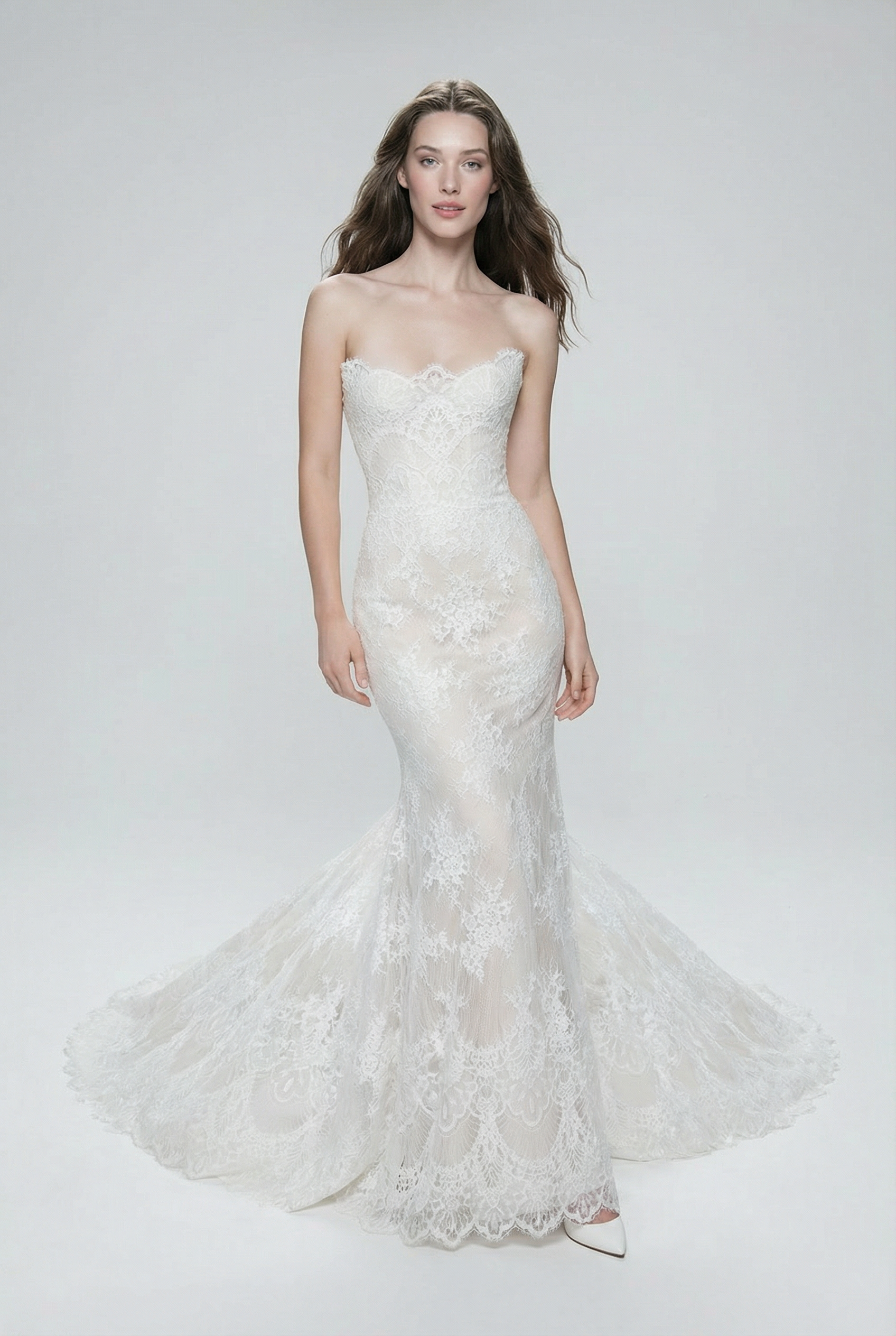 This elegant mermaid wedding gown is crafted entirely from delicate lace, sculpting the body with a clean strapless neckline and a softly contoured silhouette. The fitted bodice flows seamlessly into a refined flared hem with a subtle lace train, creating a timeless and feminine statement for the modern bride who values understated sophistication.