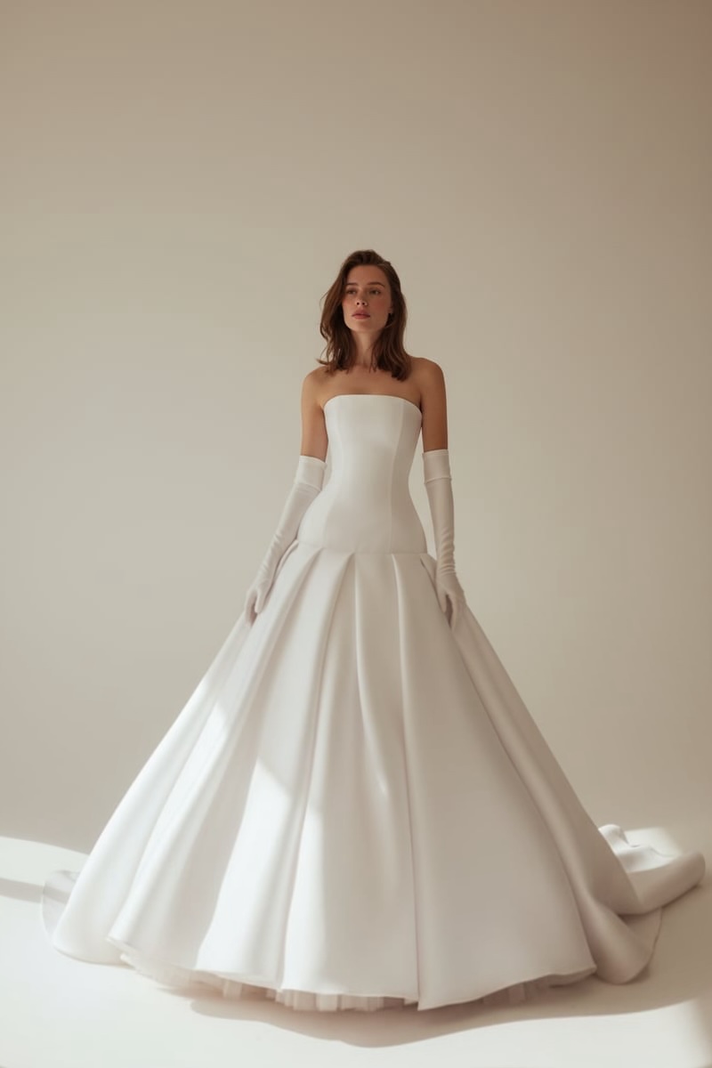 A flawlessly structured strapless corset shapes the silhouette with timeless elegance, flowing into a full pleated ball gown skirt. Crafted from smooth satin, the design offers architectural volume and graceful movement. Finished with long satin gloves for a refined couture touch, this gown is designed for brides seeking classic sophistication with modern purity.