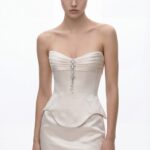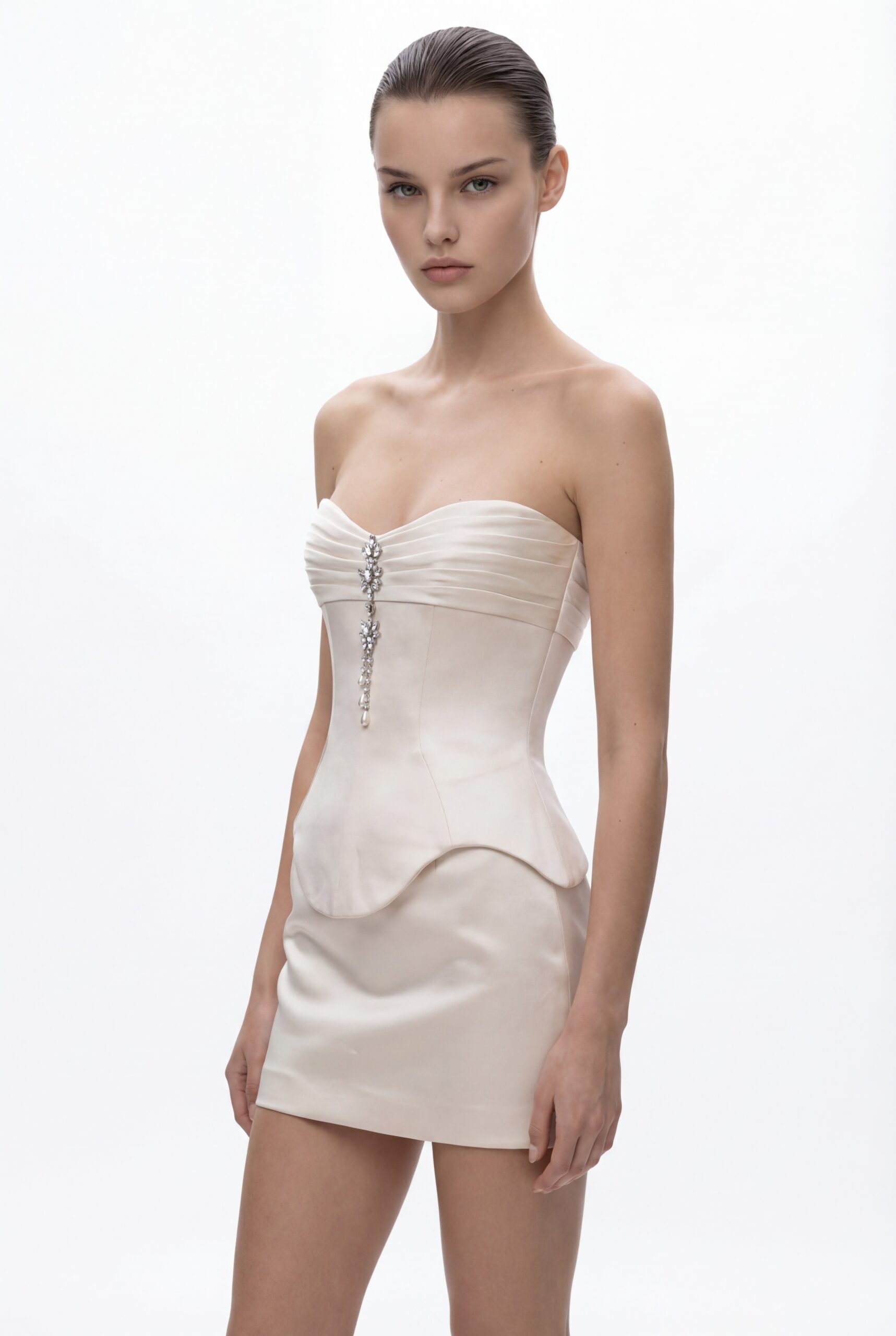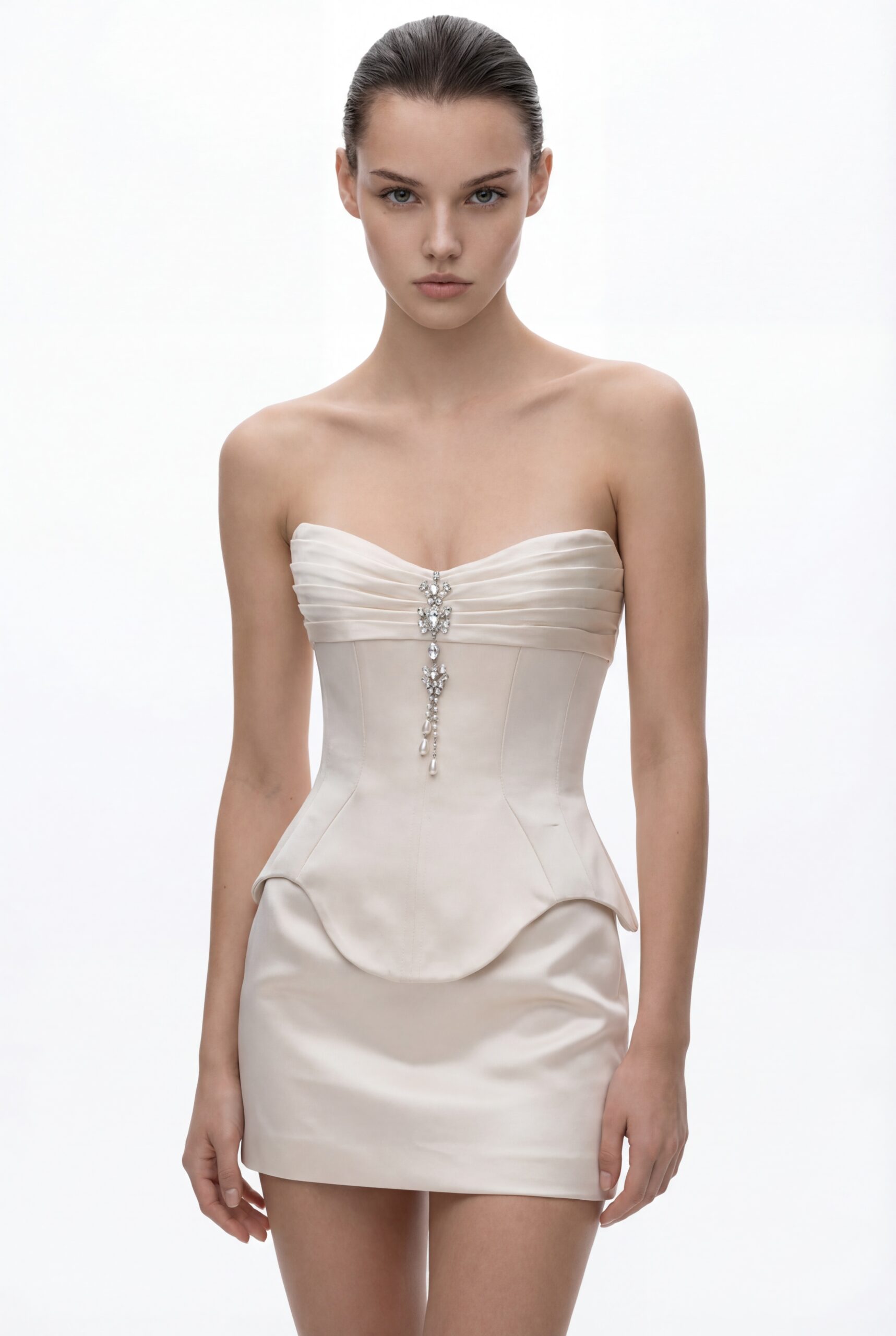 A refined silhouette defined by a sharply contoured corset and clean mini proportions. The strapless neckline features soft horizontal pleating, centered with a delicate crystal embellishment that adds a subtle focal point and light reflection. The sculpted corset extends over the hips with a curved hem, enhancing the waist and creating a strong architectural shape. The smooth satin mini skirt contrasts with the structured upper body, delivering a balanced and modern look. Designed with precision and elegance, the piece offers a contemporary take on classic corsetry.