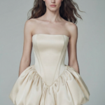 Keskin hatlarla şekillendirilmiş straplez korsaj, gövdeyi mimari bir netlikle tanımlarken heykelsi balon eteğe doğru açılır. Temiz omuz hattı yapıyı güçlendirerek siluetin güçlü bir etkiyle öne çıkmasını sağlar.