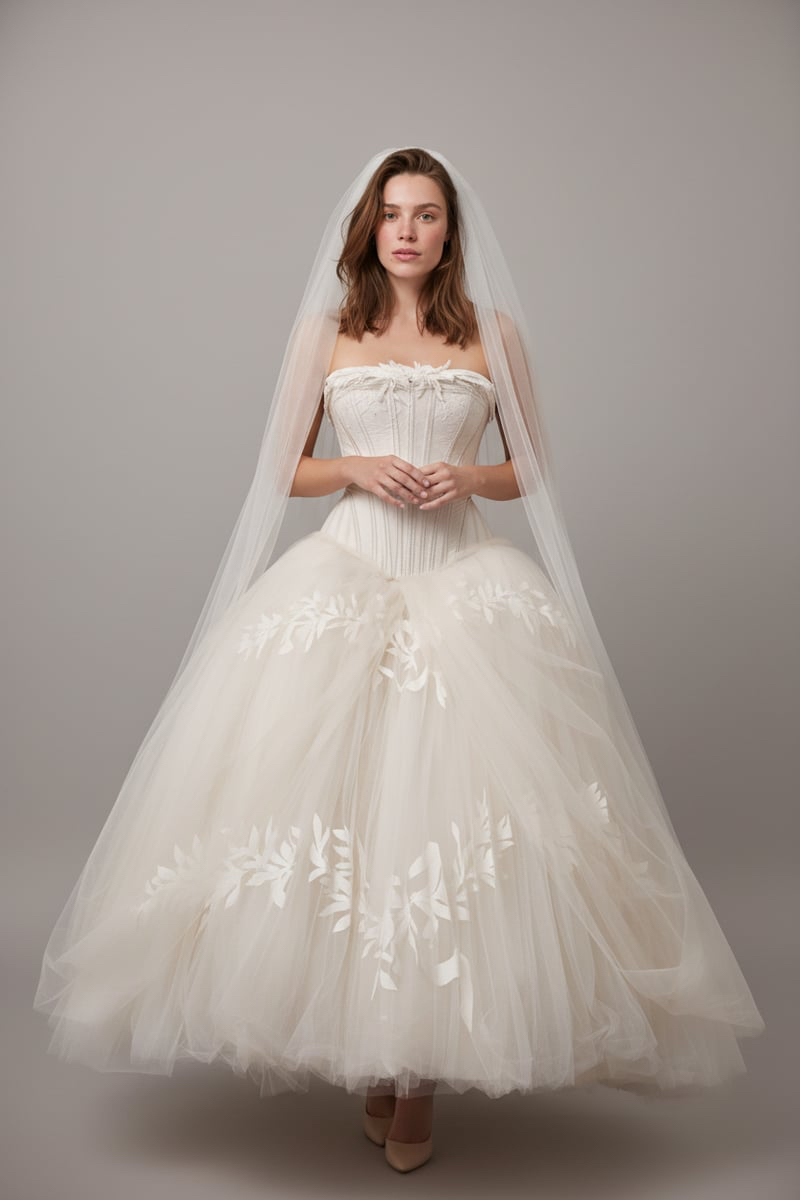 A romantic couture bridal gown featuring a structured strapless corset bodice that beautifully sculpts the waist. The voluminous tulle skirt flows with airy lightness, adorned with delicate leaf appliqués that add modern texture and poetic detail. Elegant, feminine, and effortlessly captivating, this gown is designed for brides who desire timeless drama with contemporary refinement.