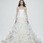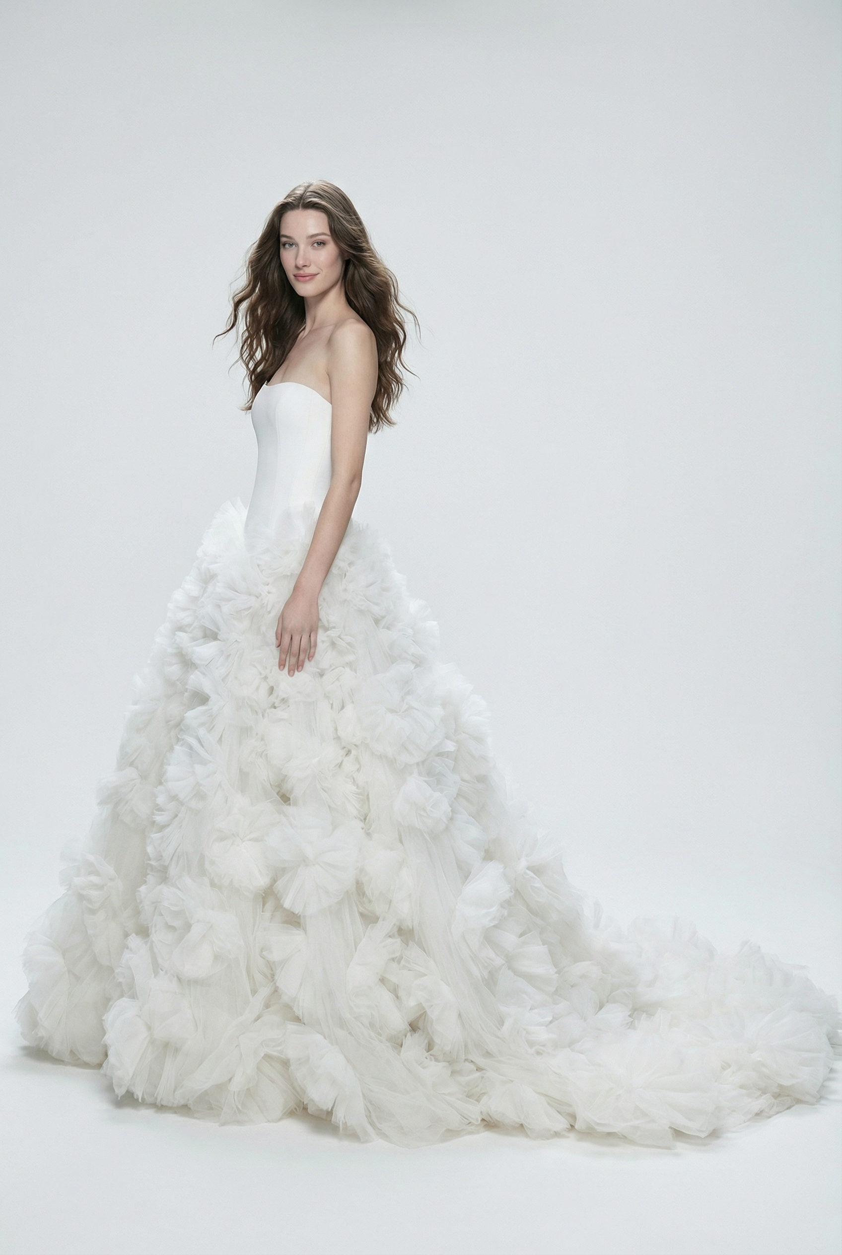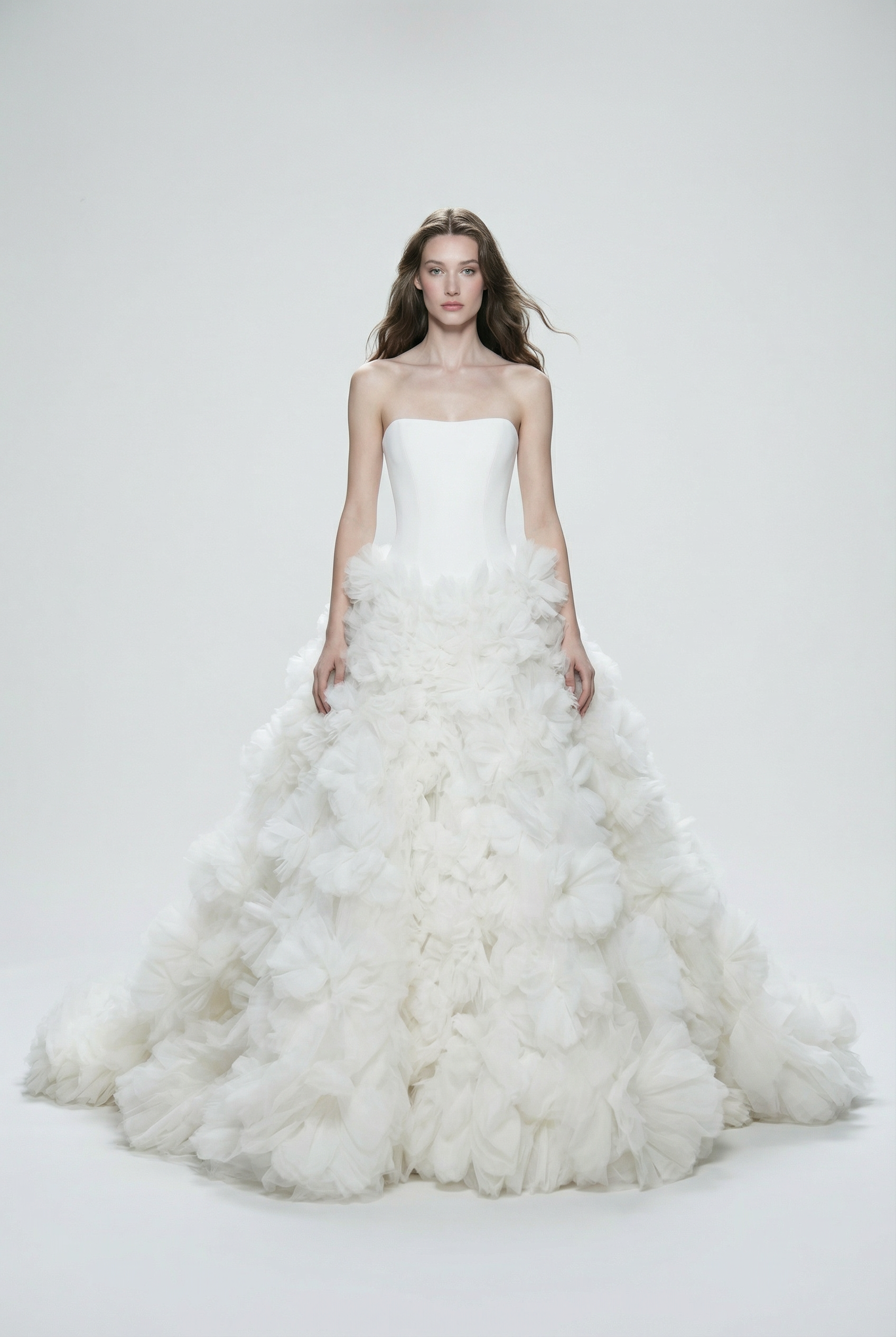 A clean, strapless bodice sculpts the upper body with architectural clarity before expanding into a dramatic, hand-worked skirt. The absence of straps sharpens the shoulder line, allowing the voluminous silhouette to command attention.