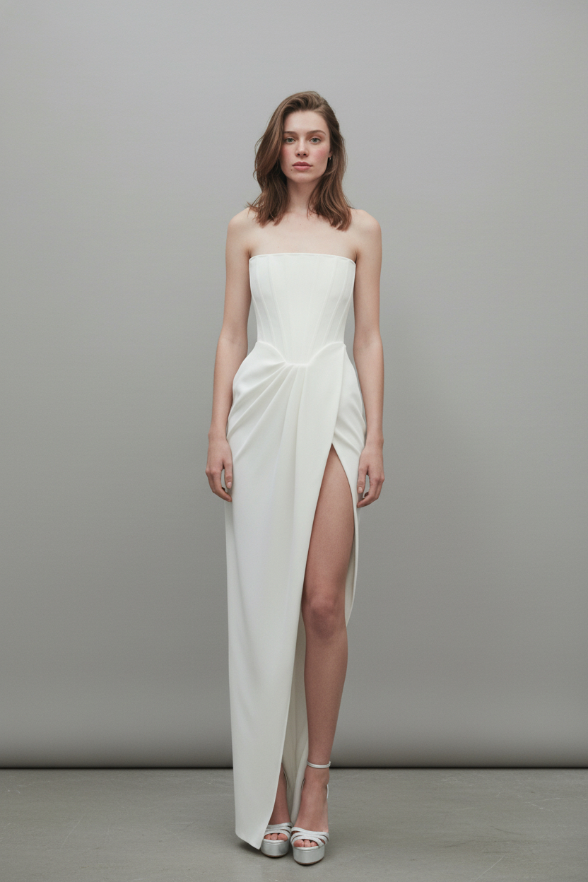 This elegant bridal features a clean strapless corset bodice that sculpts the figure with refined structure. Soft draping gathers at the waist, flowing into a sleek skirt with a high slit for modern movement and subtle allure. A minimalist yet striking design, ideal for contemporary ceremonies, civil weddings, or refined evening celebrations.