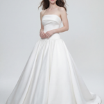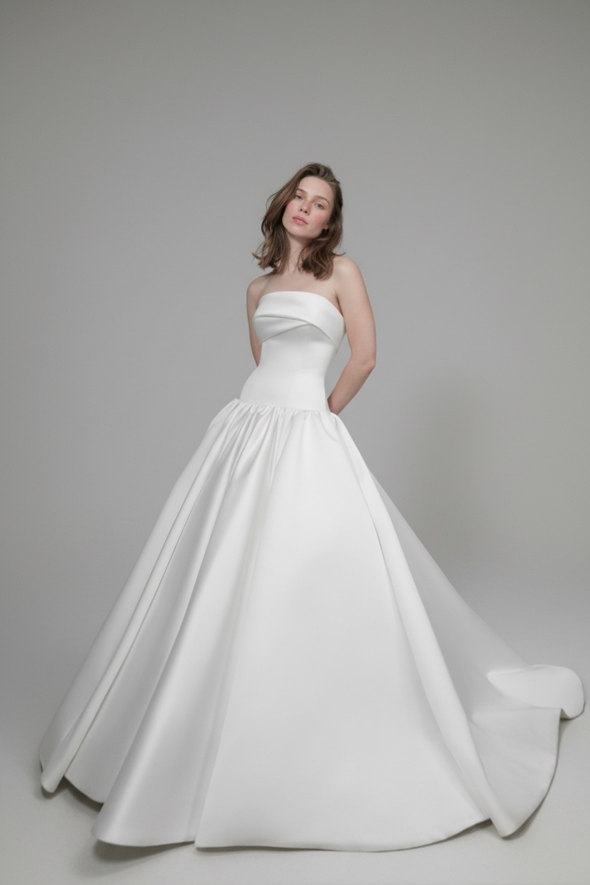 A refined strapless ball gown defined by a clean, folded neckline and a sculpted bodice that flows into a voluminous skirt. The minimalist construction highlights precise tailoring and elegant proportions, creating a timeless silhouette with modern restraint. Ideal for brides who value purity of form and understated couture elegance.