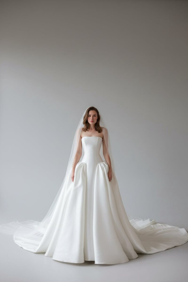 A clean strapless corset shapes the silhouette with timeless elegance, flowing into a full satin ball gown skirt with soft architectural volume. Crafted from structured satin, the design offers a refined balance of simplicity and grandeur. Finished with a sheer veil for classic bridal romance, this gown is ideal for modern yet timeless ceremonies.