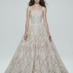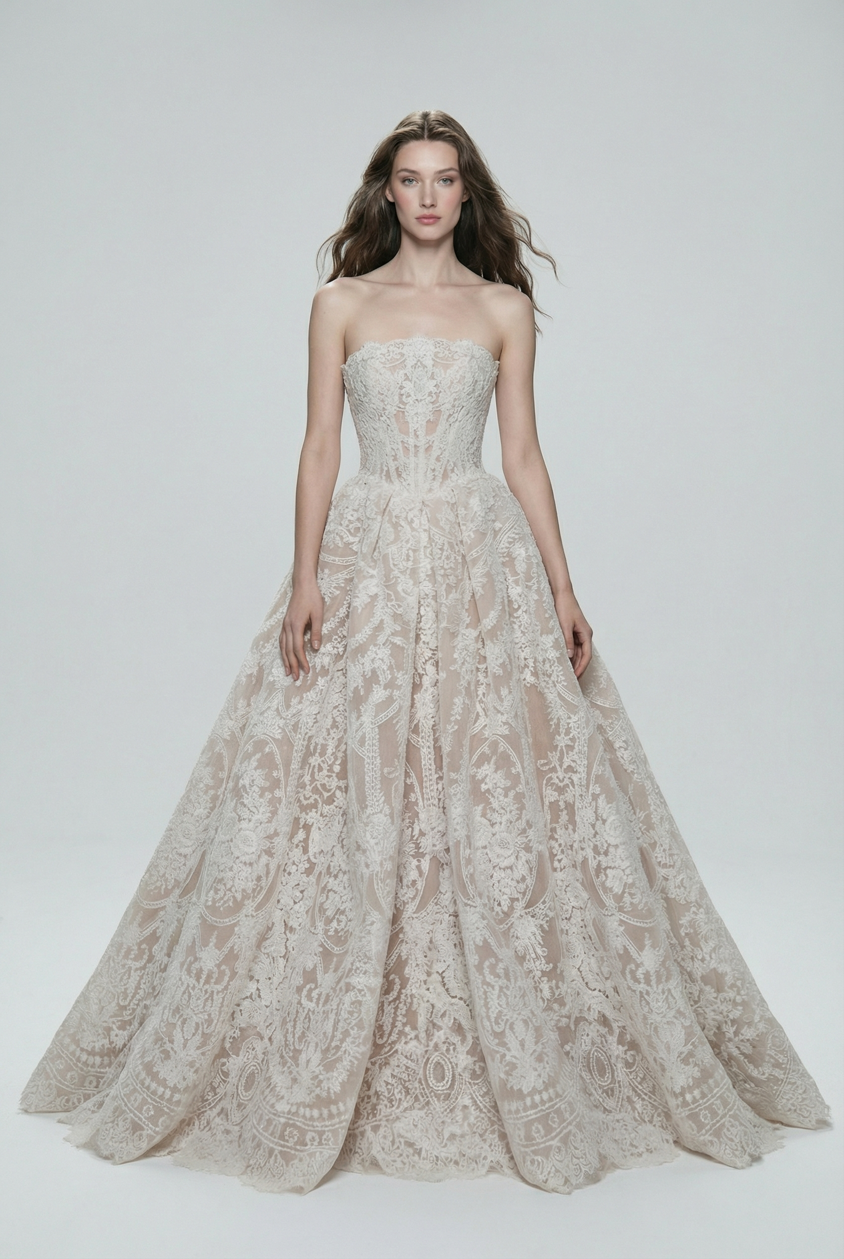 A timeless strapless ball gown crafted with a sculpted lace corset bodice and a voluminous skirt flowing into a soft train. The intricate lace pattern adds depth and romance, while the structured bodice defines the waist with couture precision. A refined silhouette designed for brides seeking classic grandeur with modern elegance.