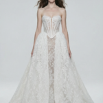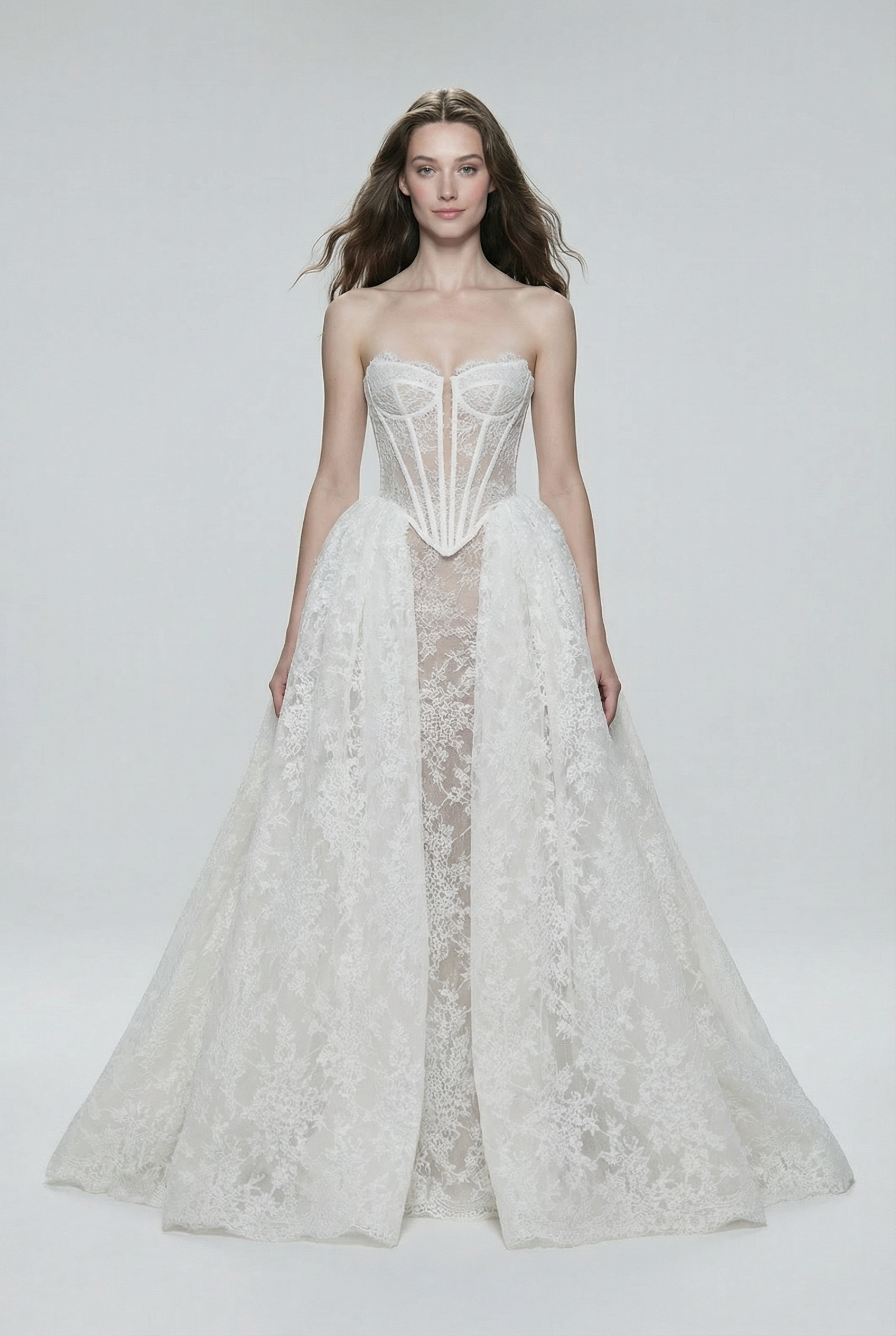 Expert corsetry shapes the body with architectural clarity, layered over fine lace. A voluminous overskirt introduces softness and movement, creating a versatile couture silhouette.