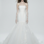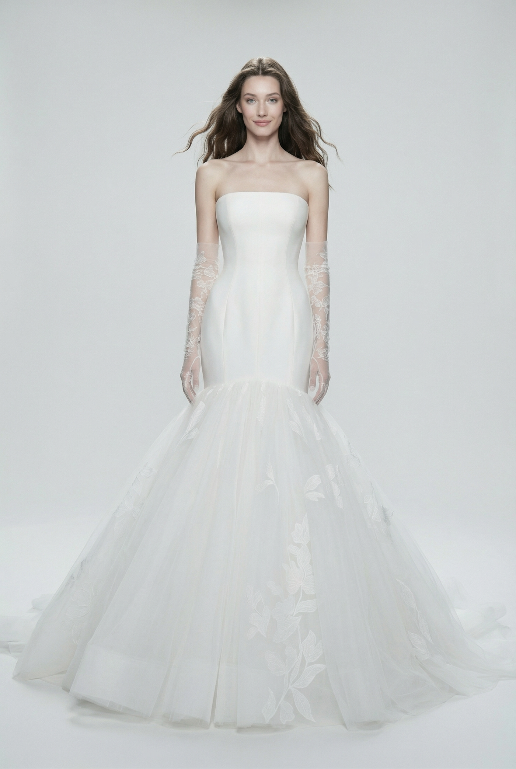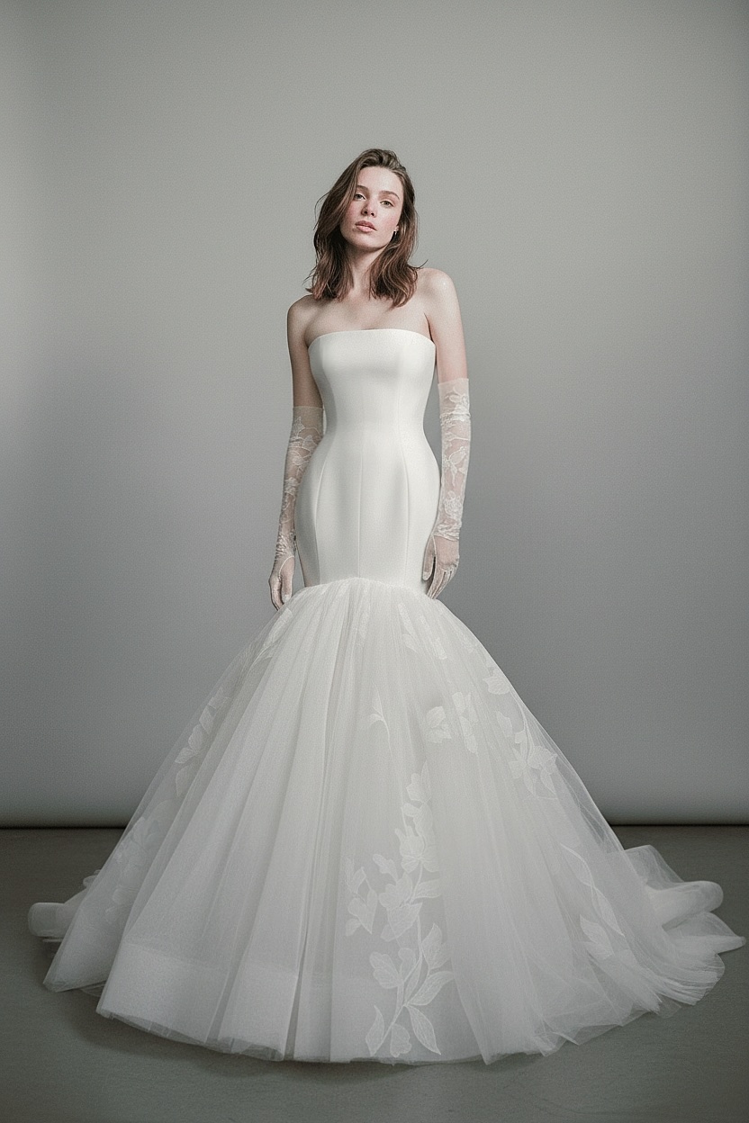 A sleek strapless mermaid gown crafted with a sculpted bodice that transitions into a dramatic tulle skirt. Delicate floral motifs accent the movement of the skirt, offering a timeless blend of modern minimalism and romantic softness.