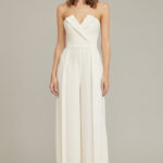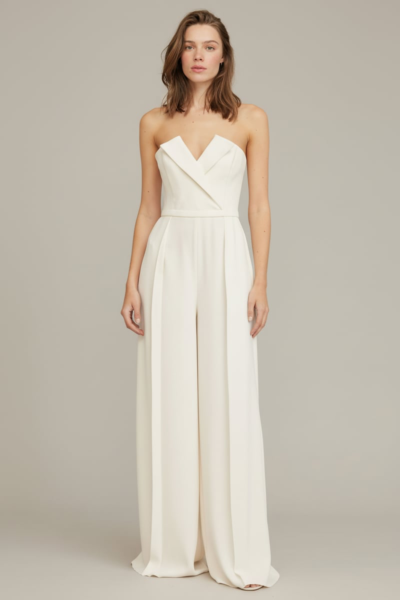 A strapless jumpsuit defined by precise structure and effortless flow. The wide-leg silhouette offers modern elegance with understated confidence.