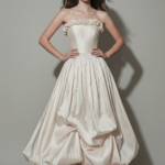 Yumuşak fildişi tonlarında saten kumaştan tasarlanan bu straplez korse gelinlik, yakadaki zarif fırfır detayıyla romantik bir ifade sunar. Vücudu saran üst form, heykelsi drapelerle şekillenen hacimli etekle birleşerek etkileyici bir hareket ve couture duruş yaratır. Modern törenler ve güçlü bir stil ifadesi arayan gelinler için sofistike bir tasarımdır.